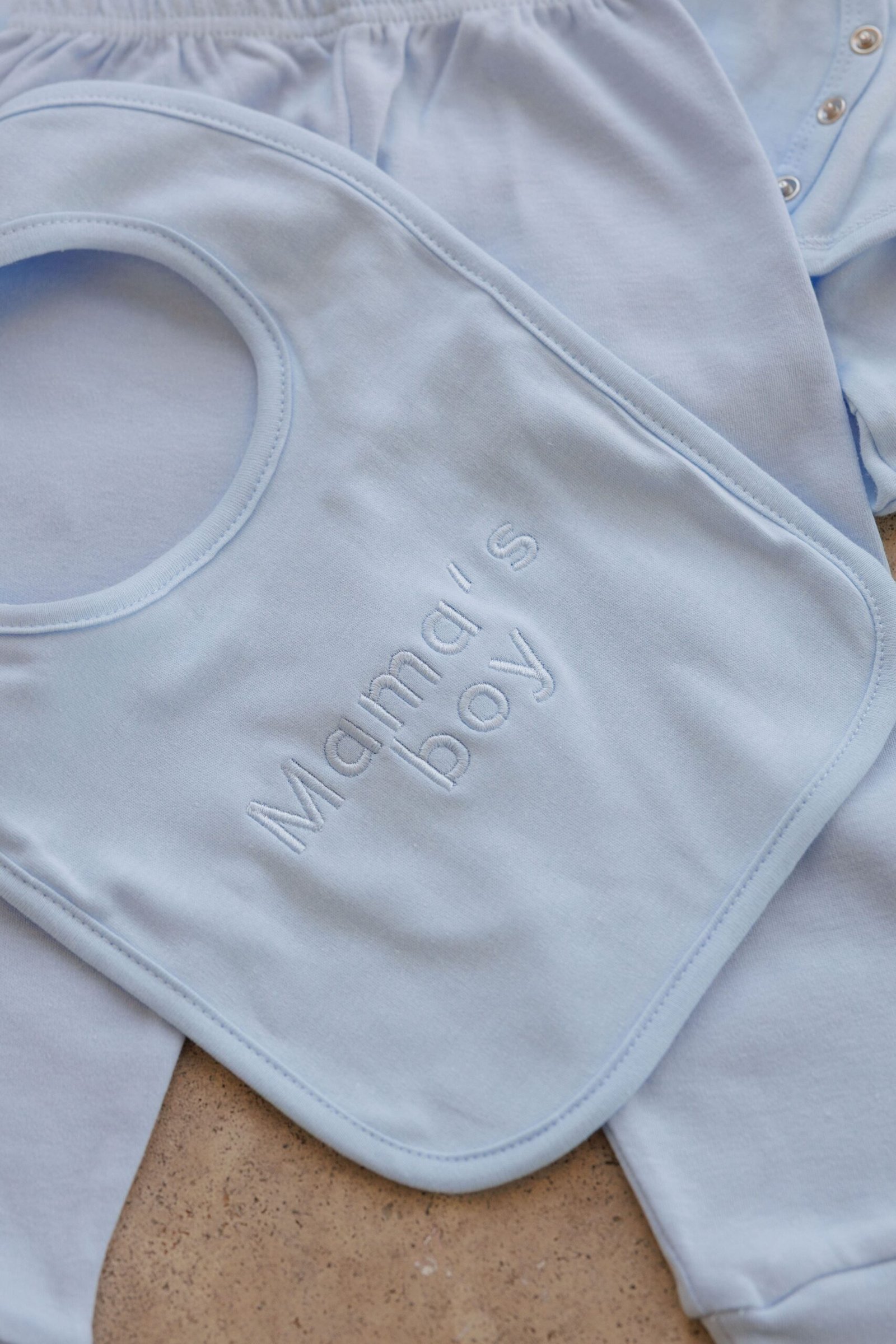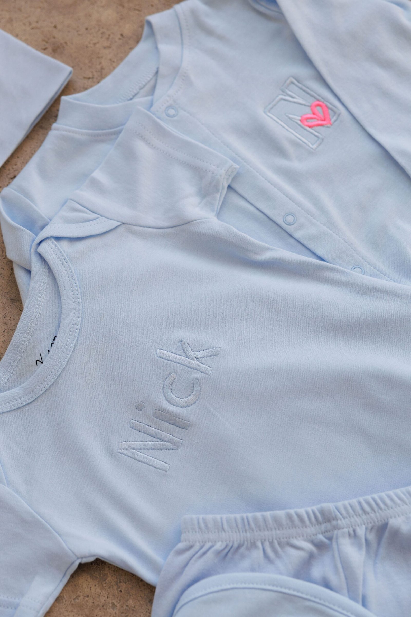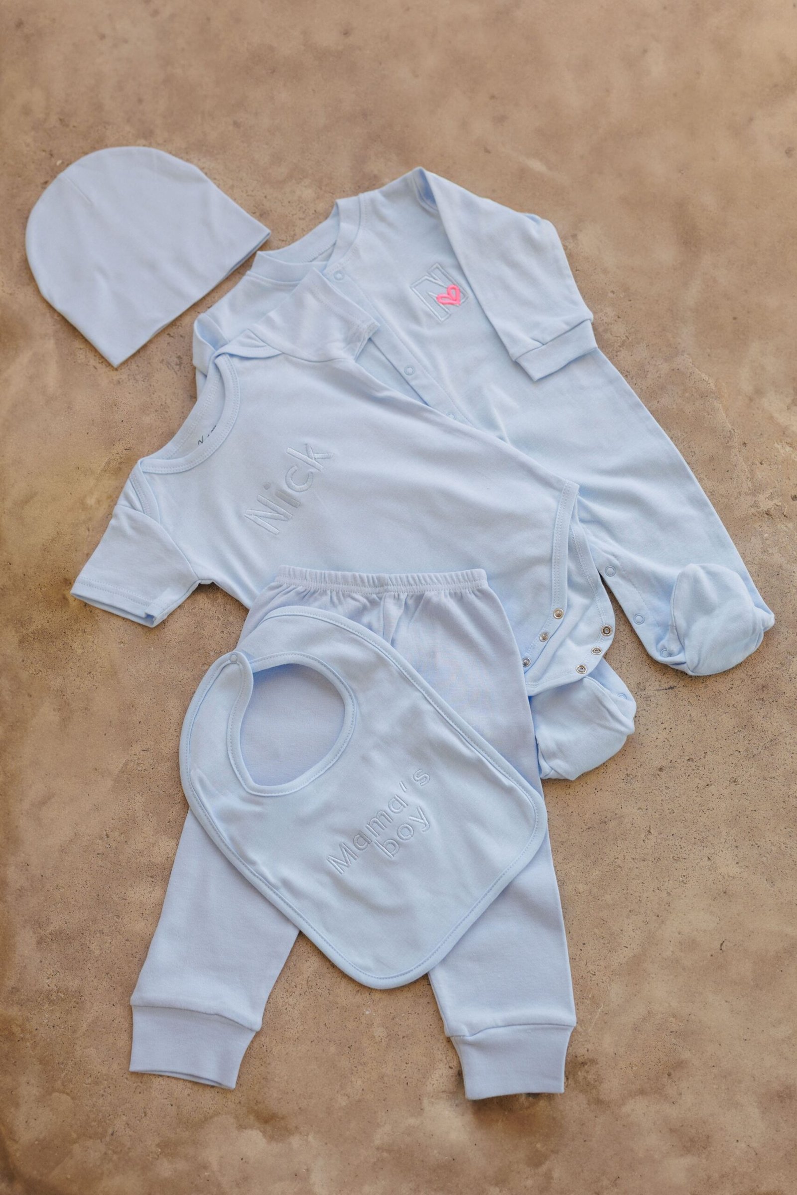 Essential newborn set made from soft cotton. Includes bodysuit, long-sleeve onesie, pants, bib and hat.
