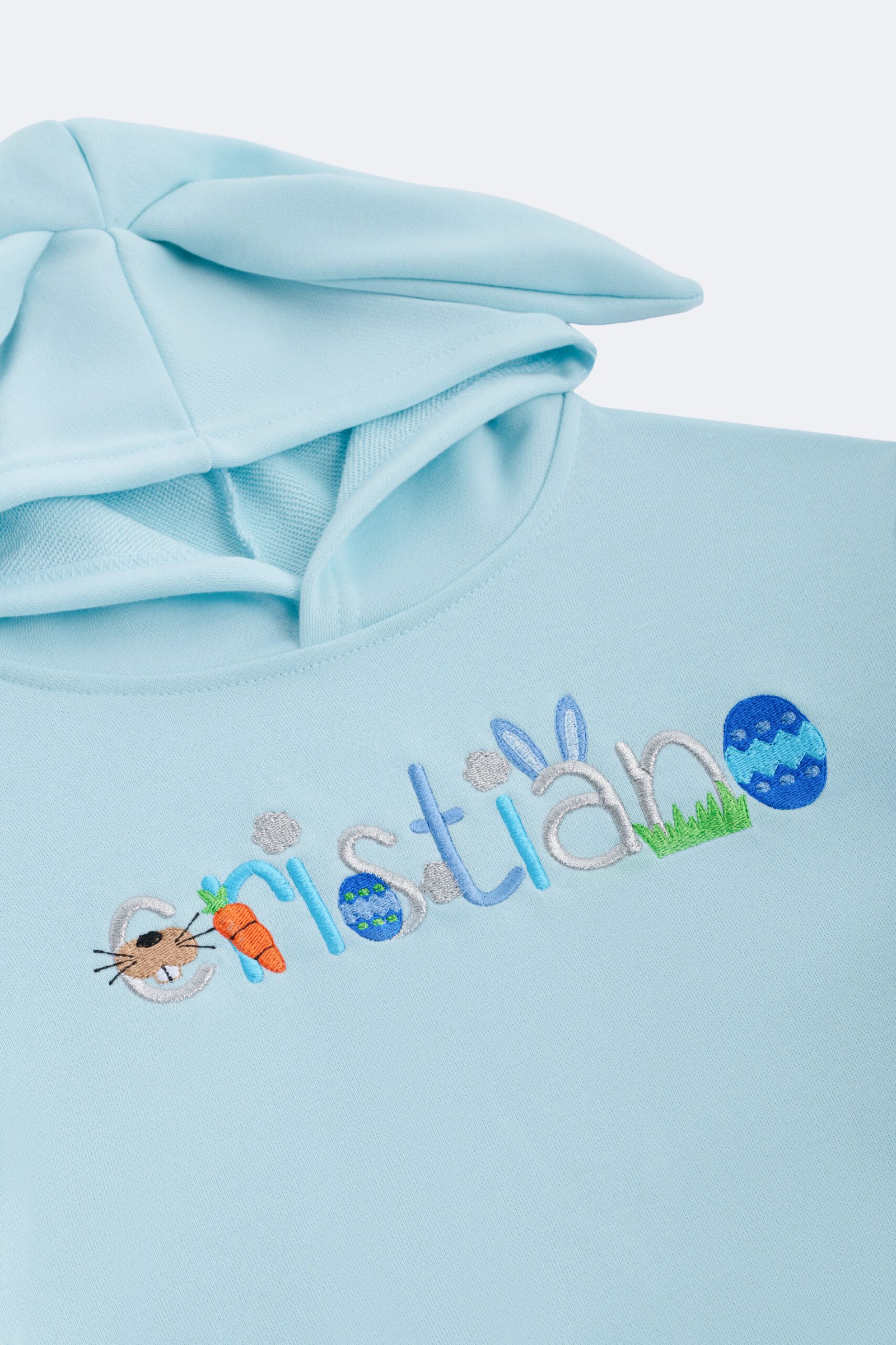 Hooded bodysuit with long sleeves and snap-button fastening at the bottom. Bunny-ear detail on the back.
