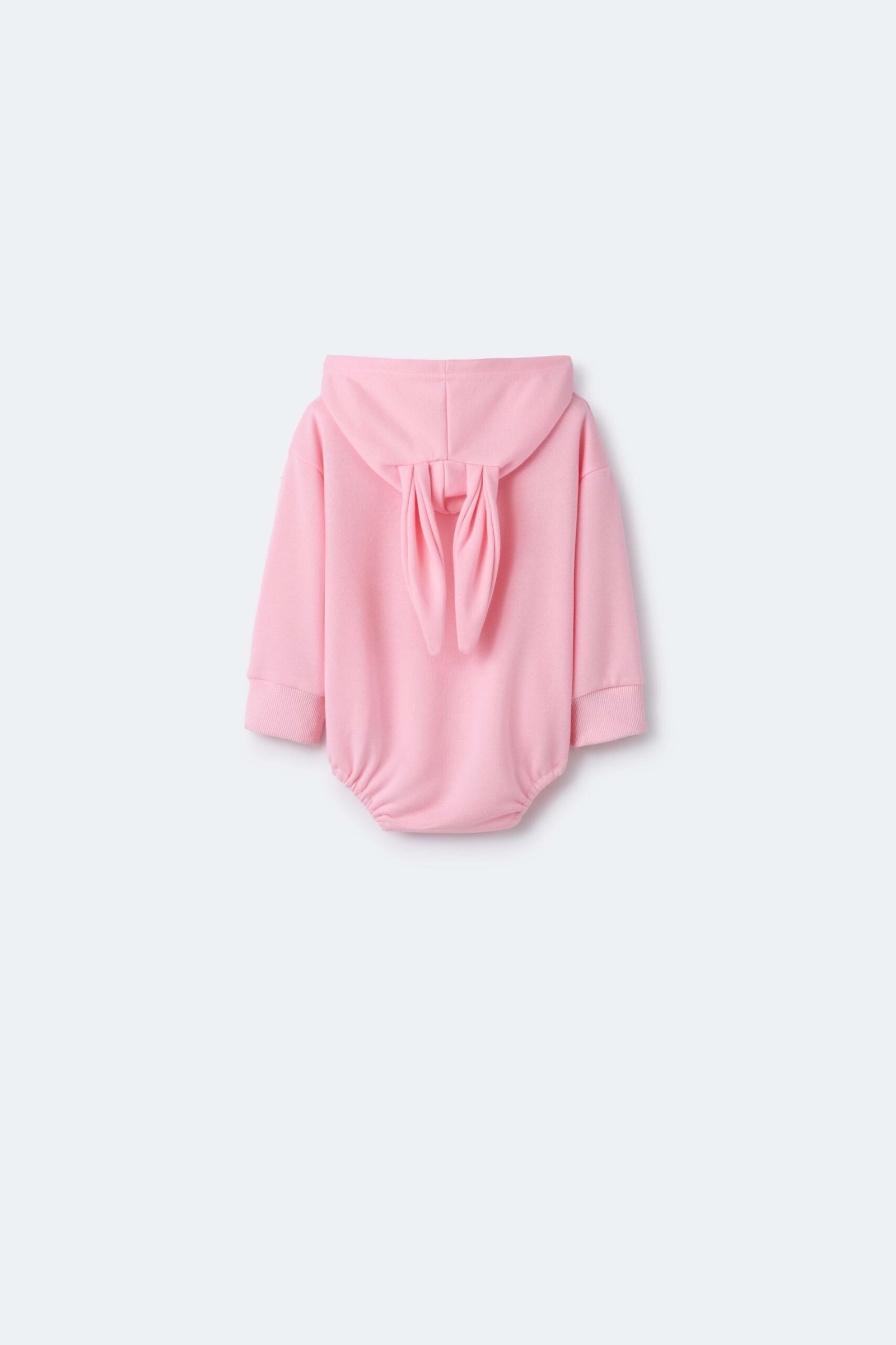 Hooded bodysuit with long sleeves and snap-button fastening at the bottom. Bunny-ear detail on the back.