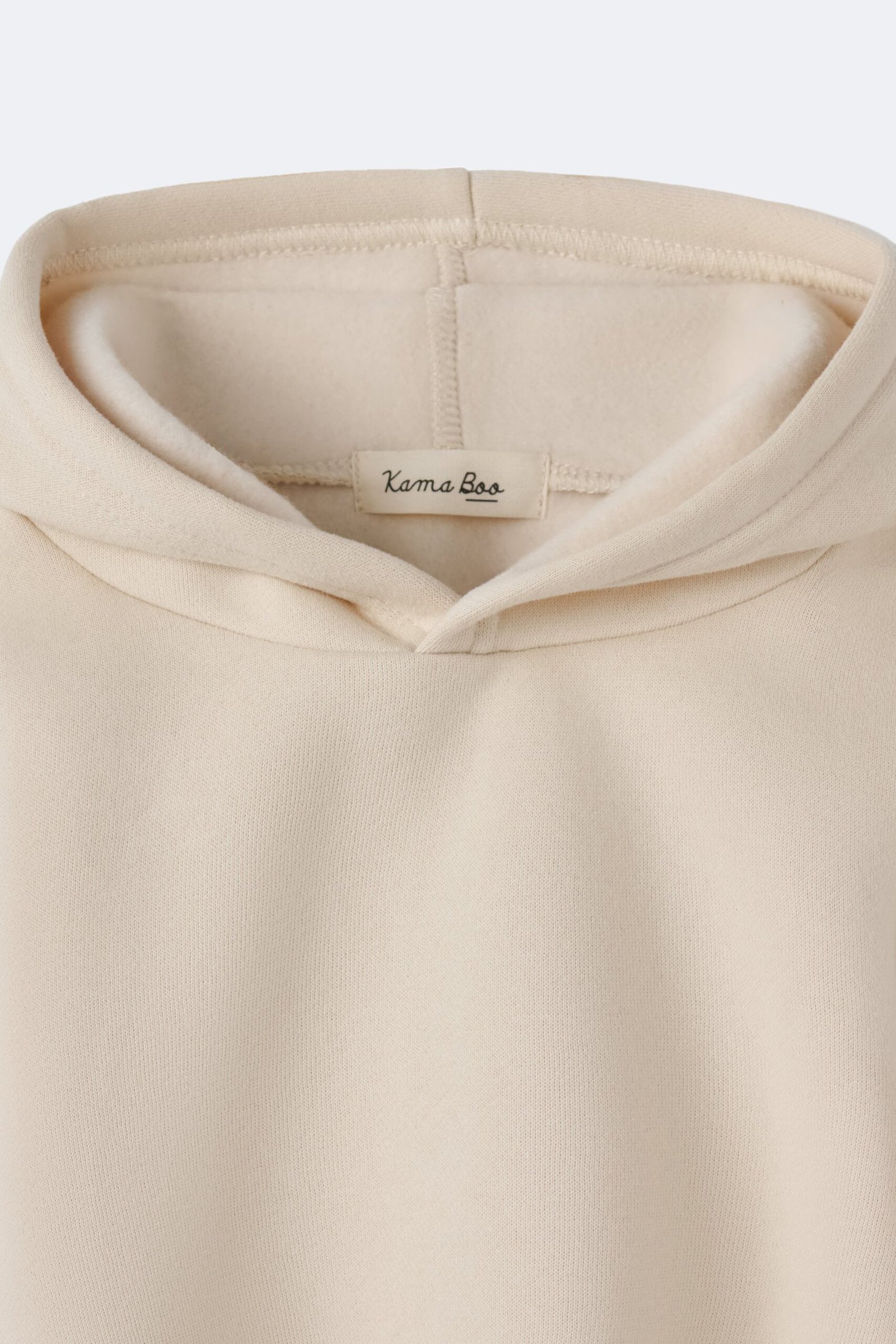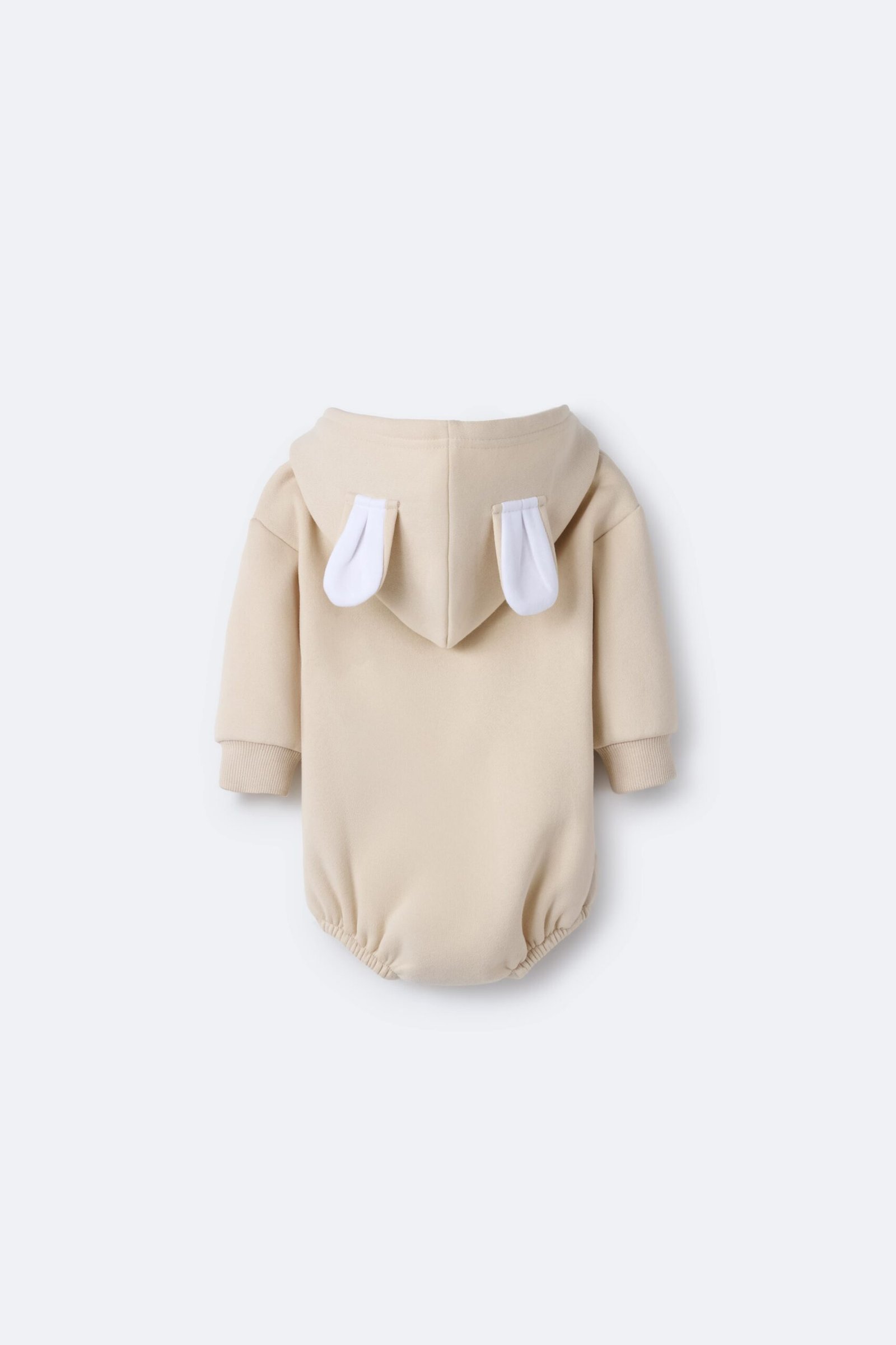 Warm thick hooded bodysuit with long sleeves and snap-button fastening at the bottom. Ear detail on the back.
