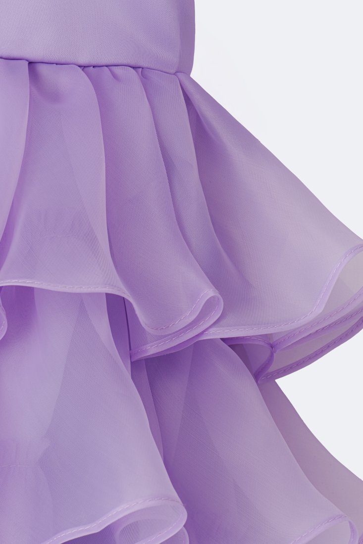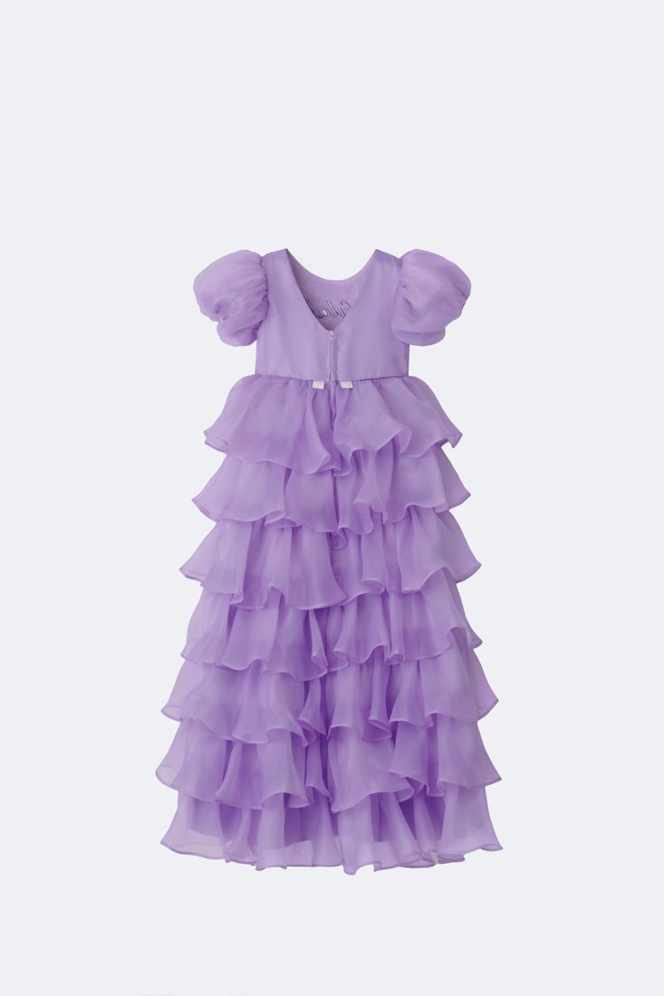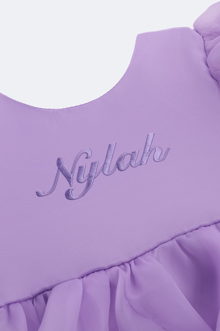 Dress with short puff sleeves and layered cascade ruffle skirt. Personalized name detail on the chest. High-low hemline. Back closure with zipper.