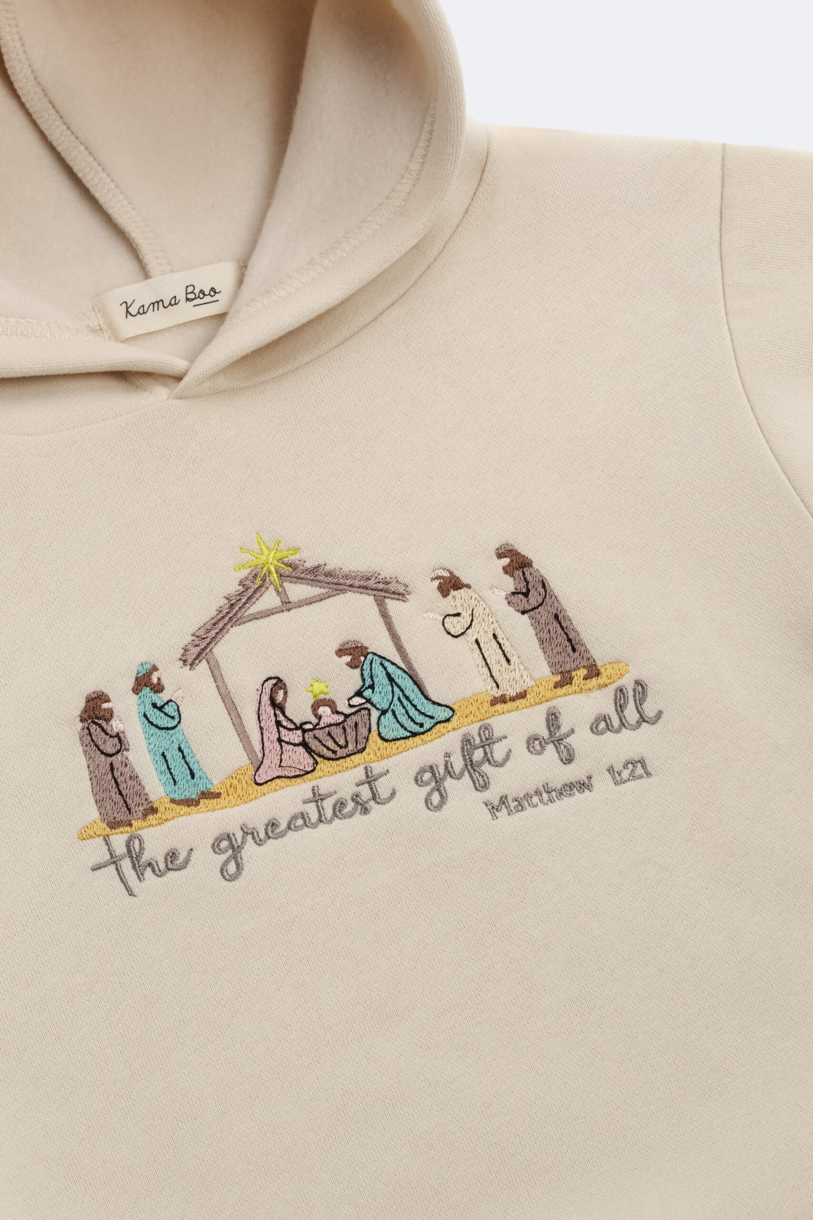 Soft cotton bodysuit with an embroidered holy night motif with subtle tones and bear ears on the hood.
