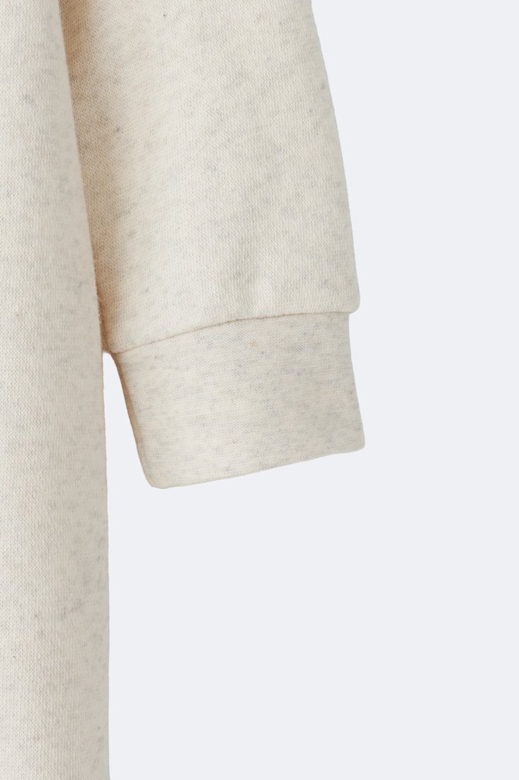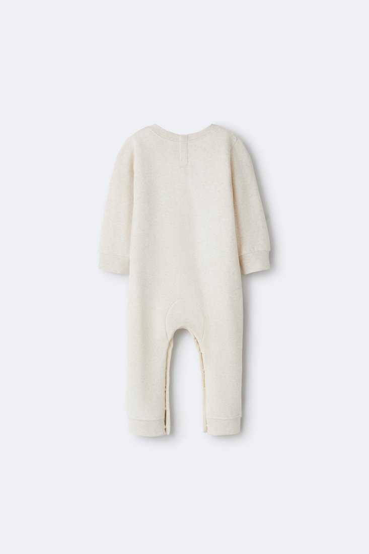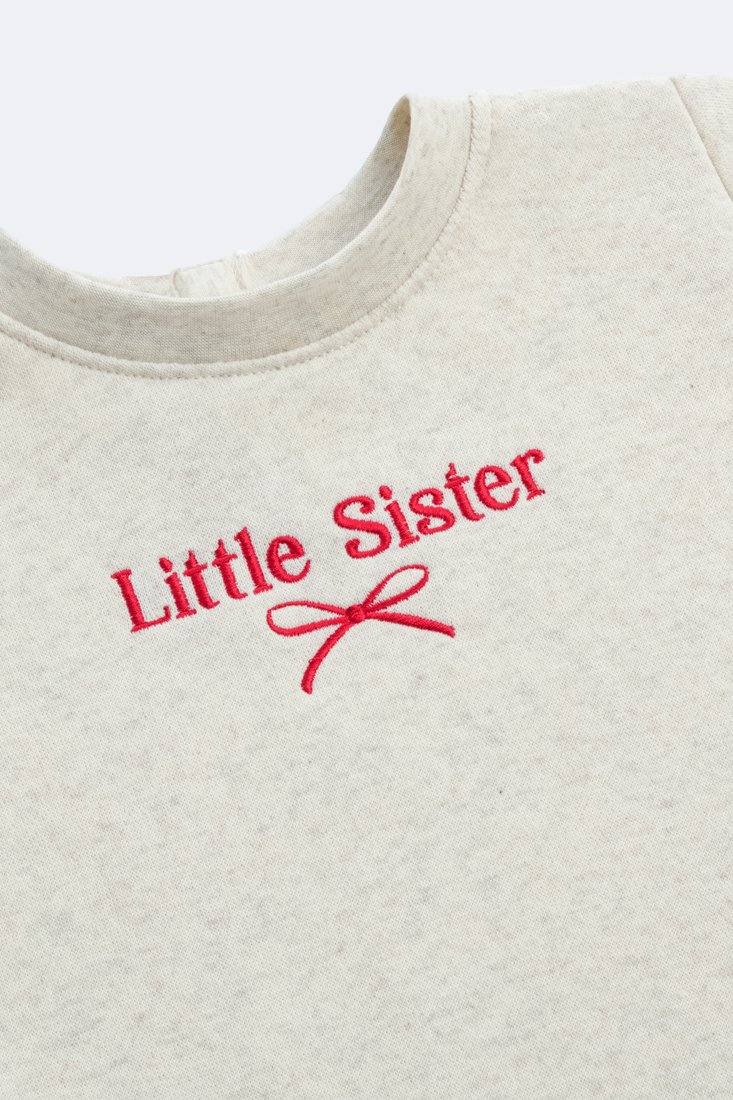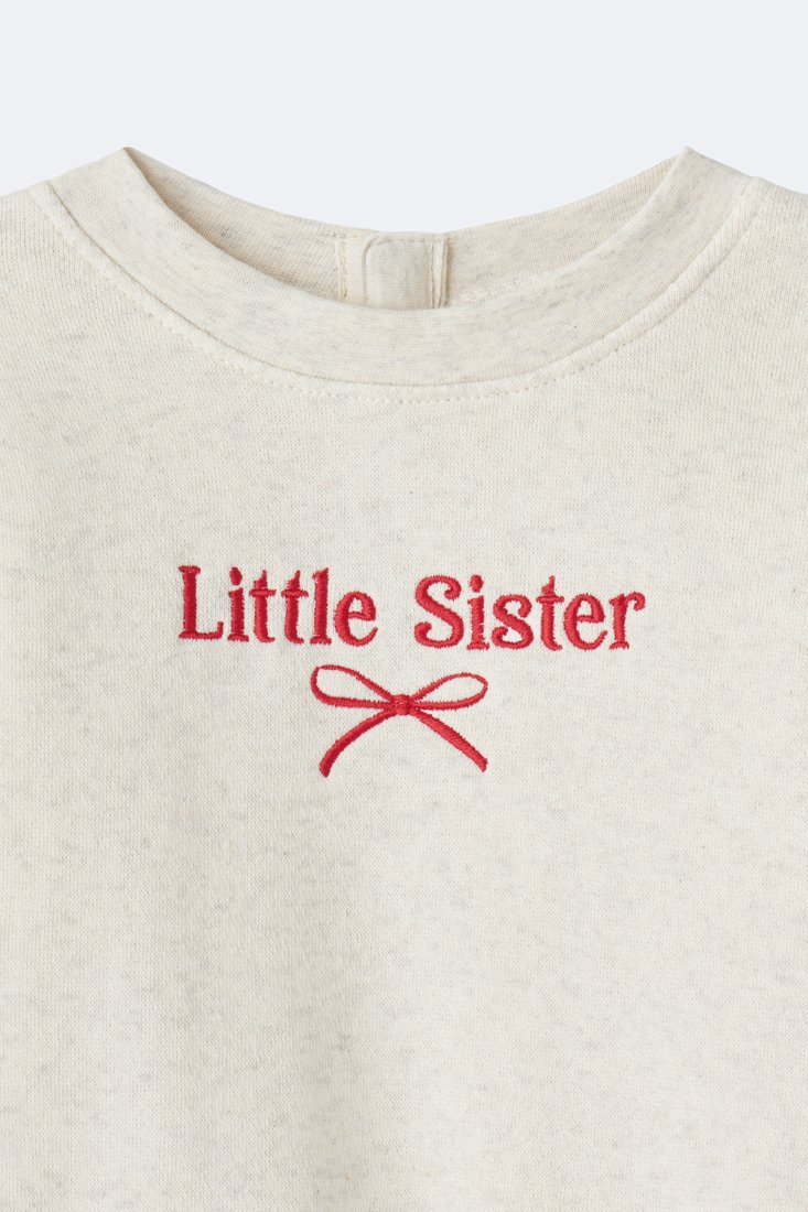 Long-sleeved jumpsuit in fleece with ribbed trims. “Little Sister” text with bow detail on the front.