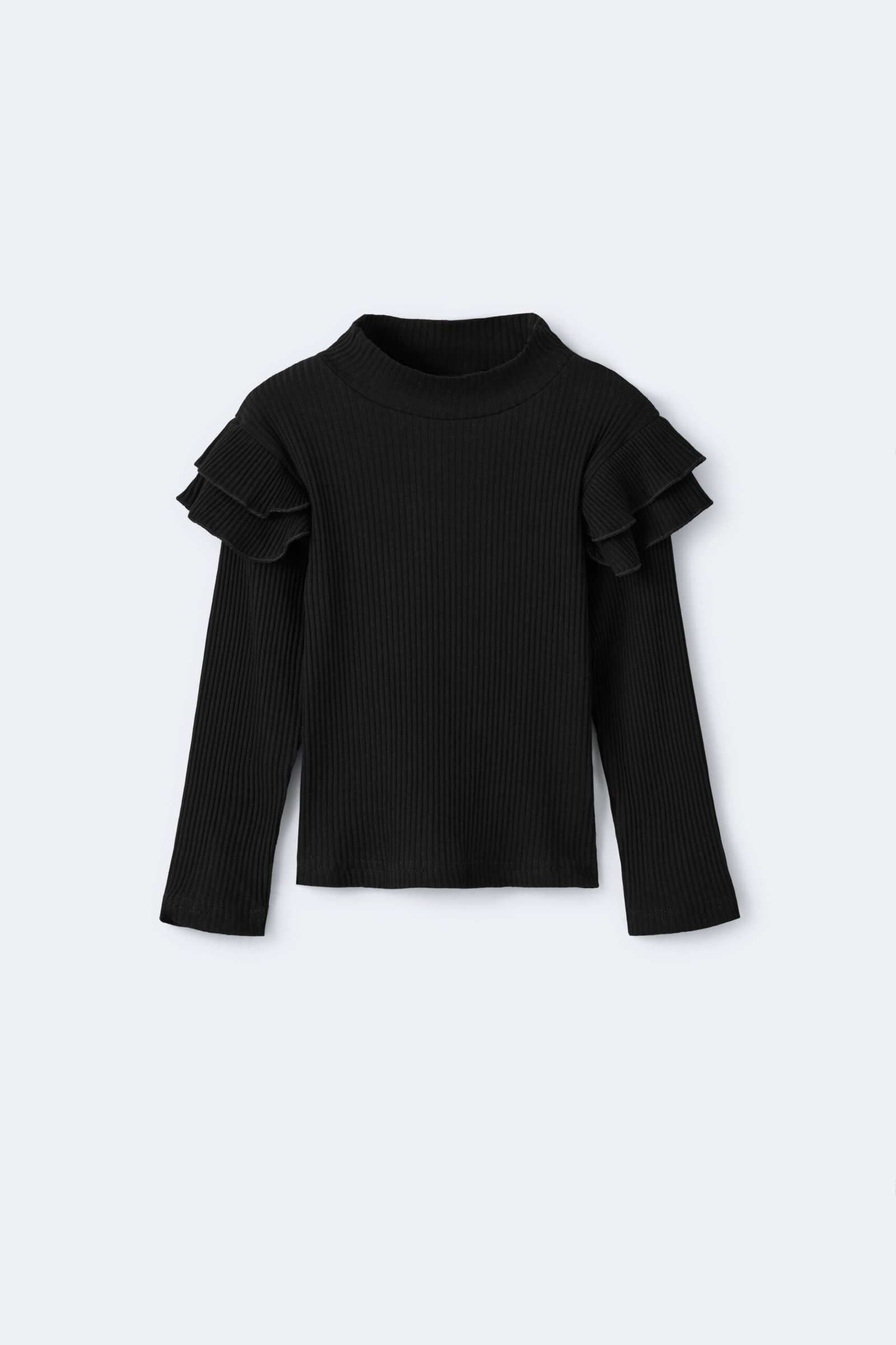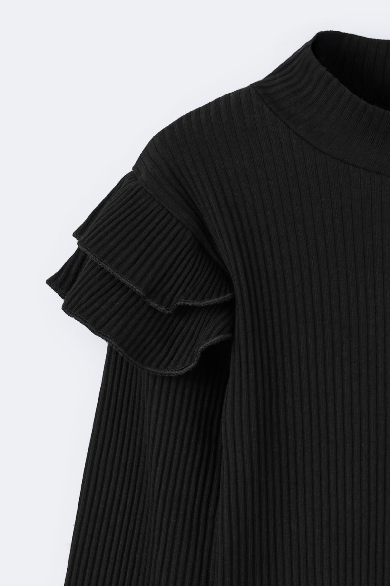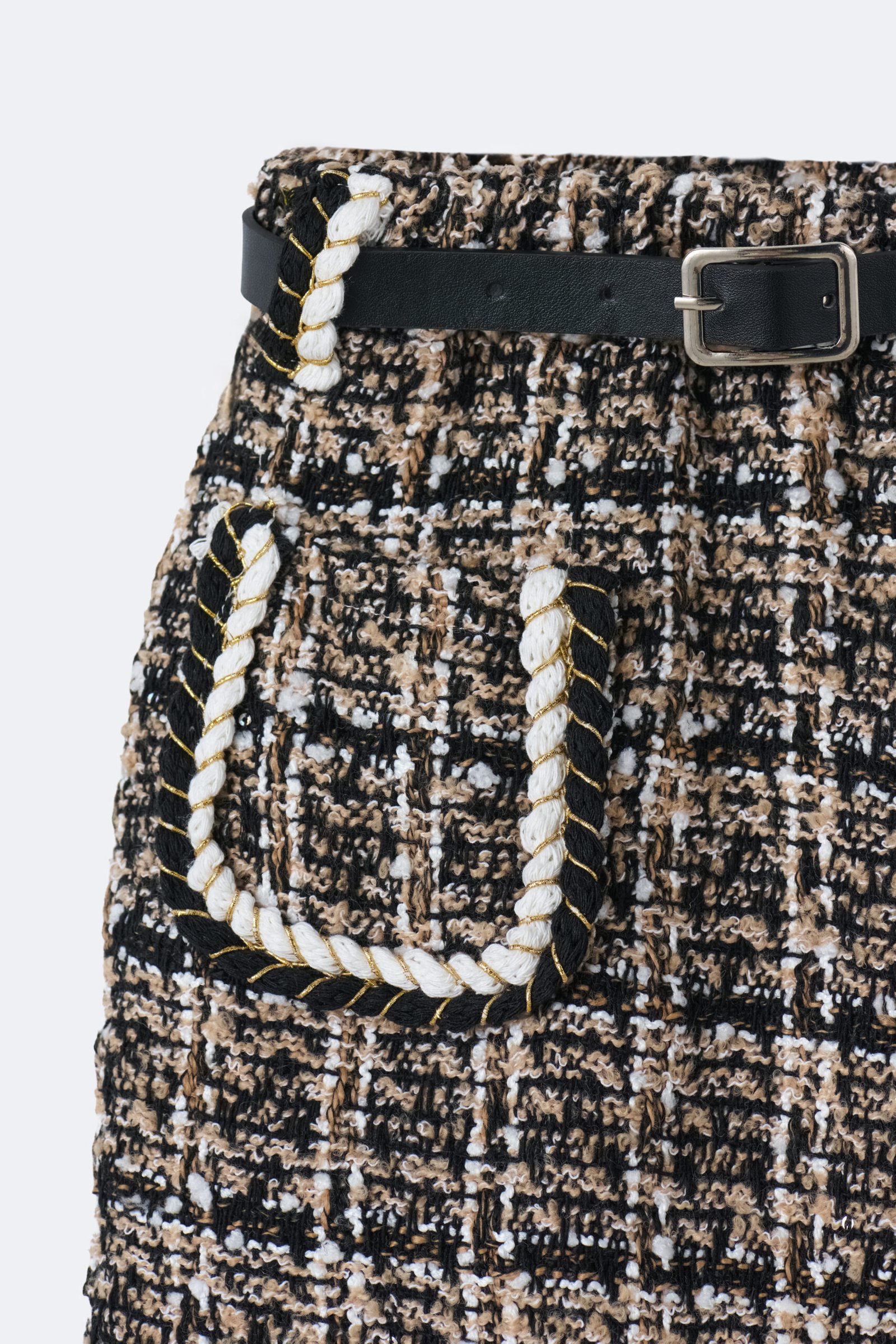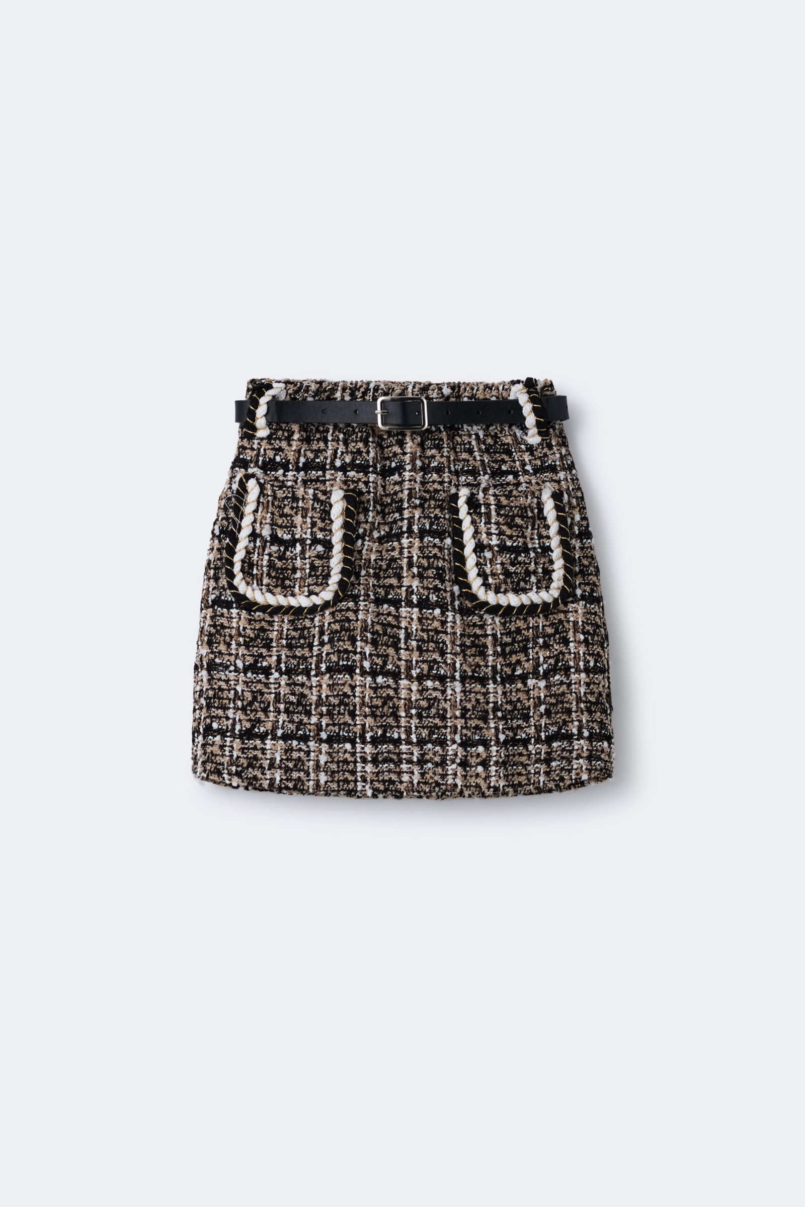 Set featuring a ribbed long-sleeve top with ruffle details on the shoulders. Personalized embroidery on the front. Tweed skirt with decorative pocket details and matching belt.