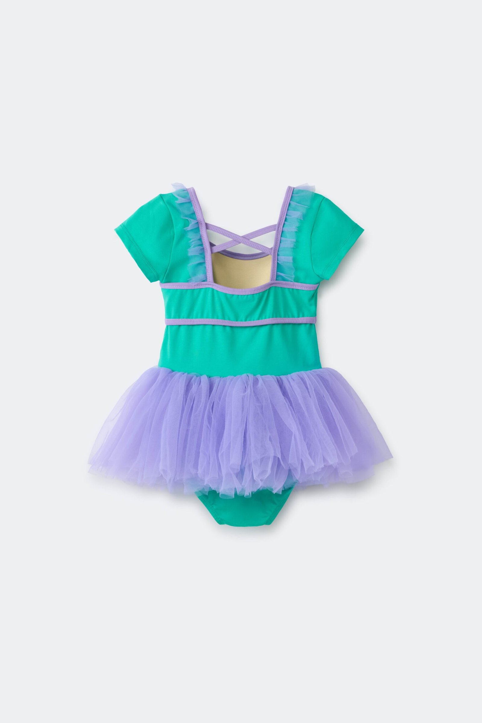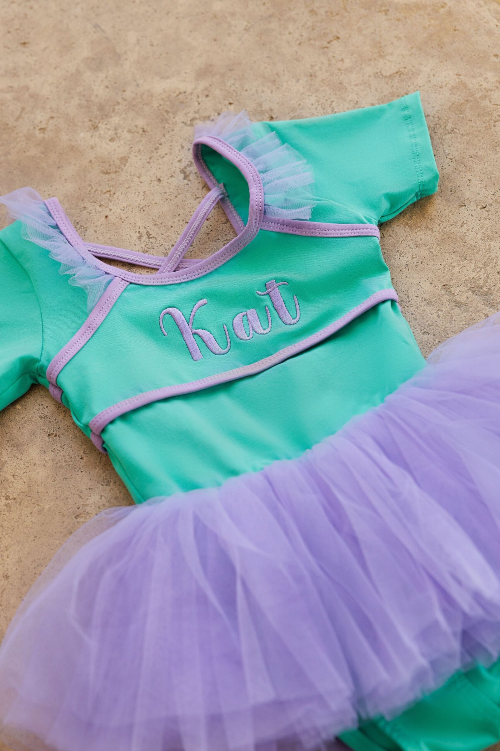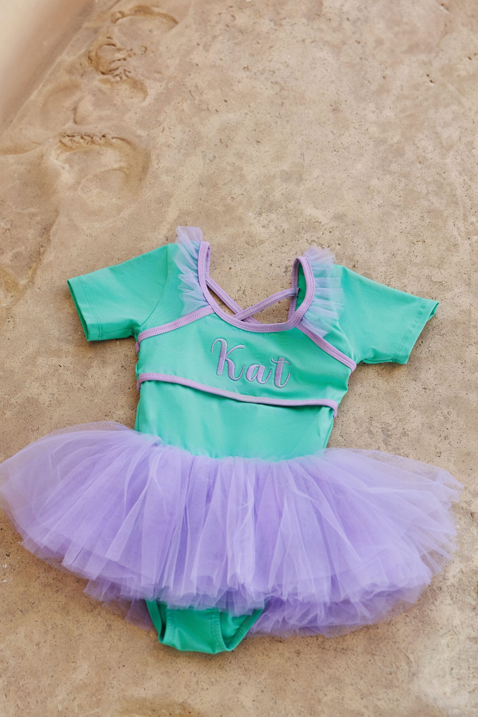 Comfortable stretch bodice with short sleeves and cross-back straps. Contrast trim and ruffle details on the shoulders. Soft layered tutu skirt that’s lightweight and perfect for twirling. Personalized embroidery on the front.