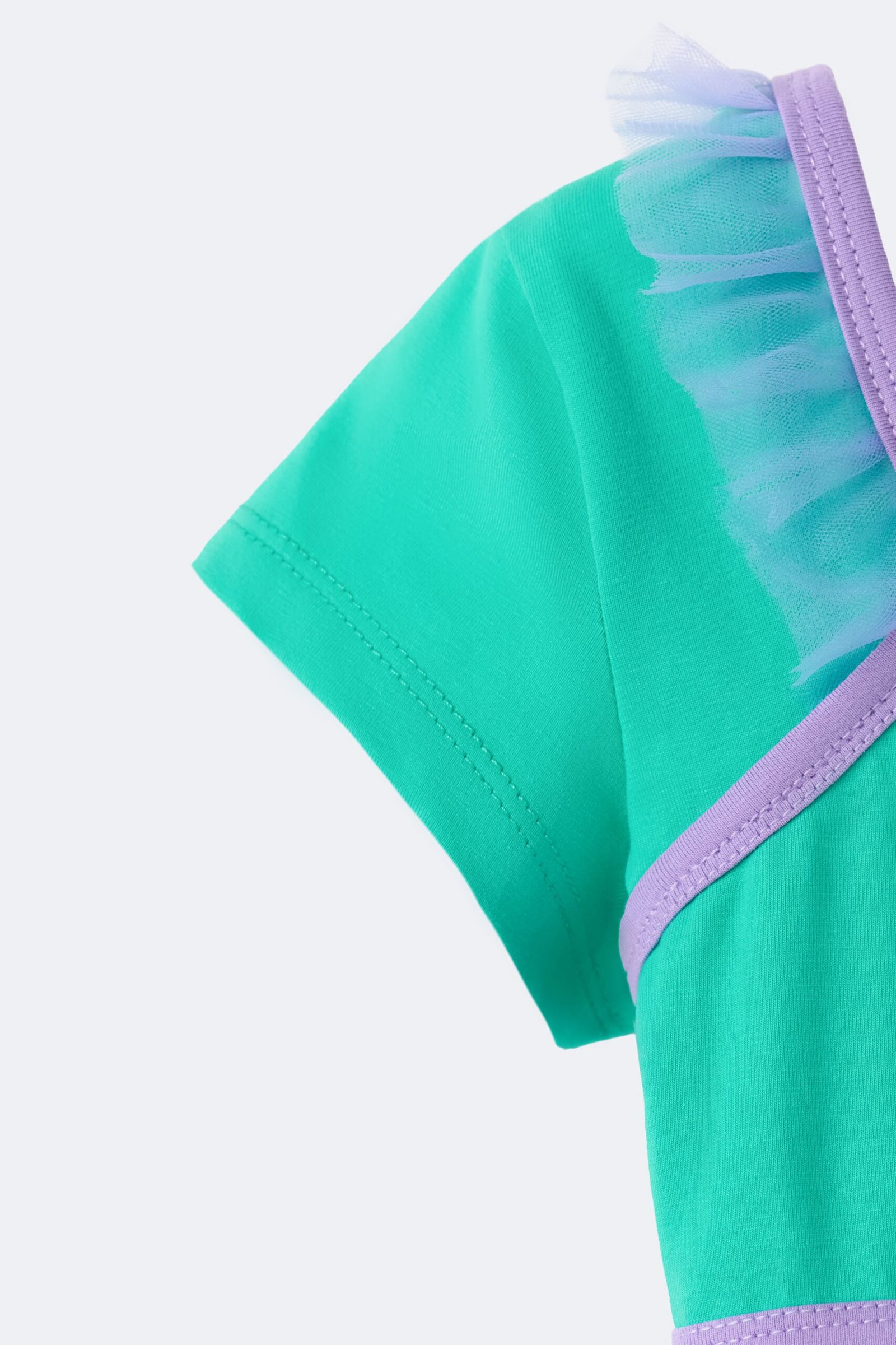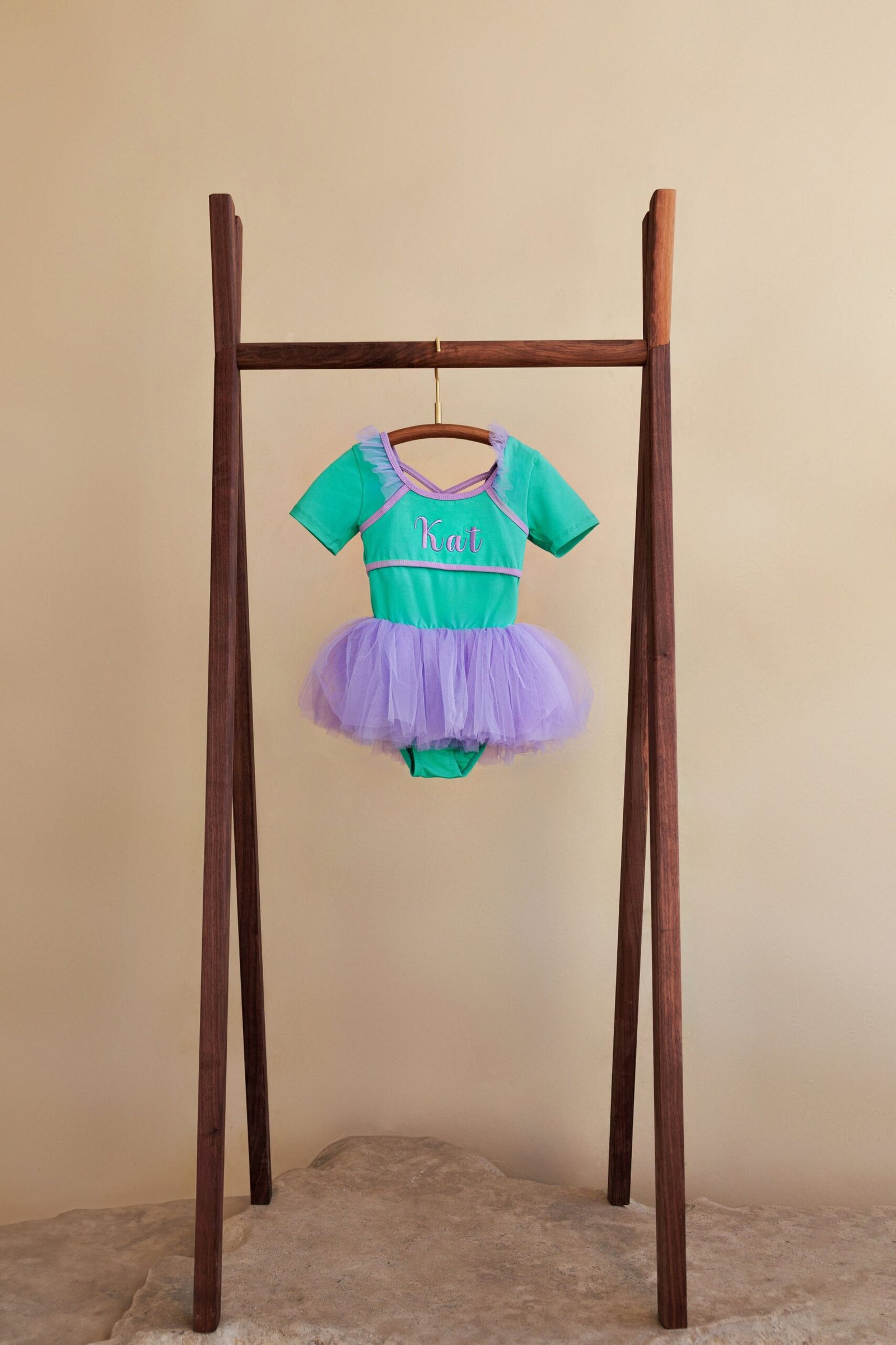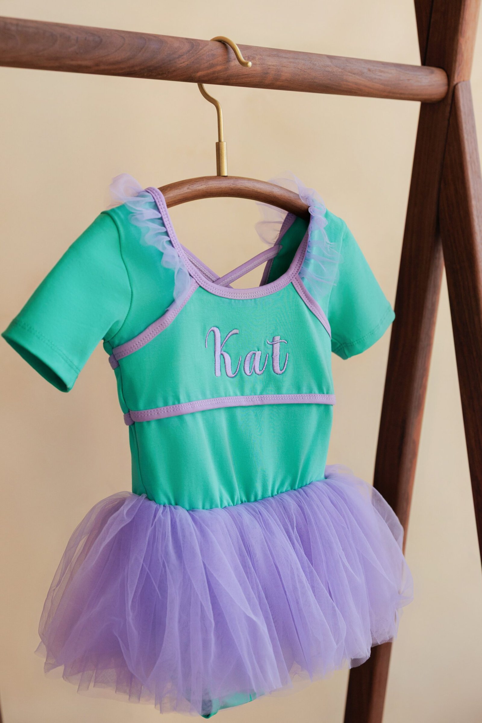 Comfortable stretch bodice with short sleeves and cross-back straps. Contrast trim and ruffle details on the shoulders. Soft layered tutu skirt that’s lightweight and perfect for twirling. Personalized embroidery on the front.