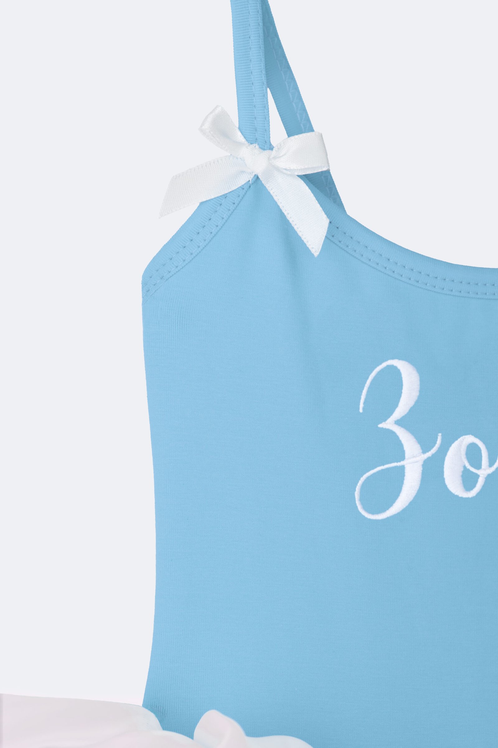 Dress with thin straps and bow details on the shoulders. Comfortable stretch bodice with personalized embroidery on the front. Soft layered tutu skirt that’s lightweight and perfect for twirling.