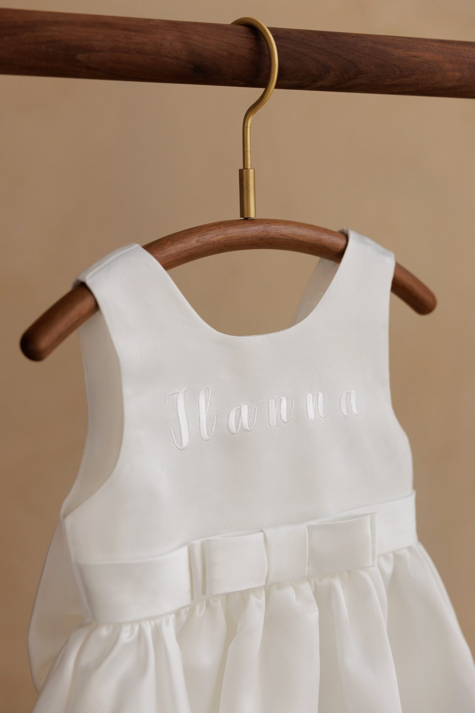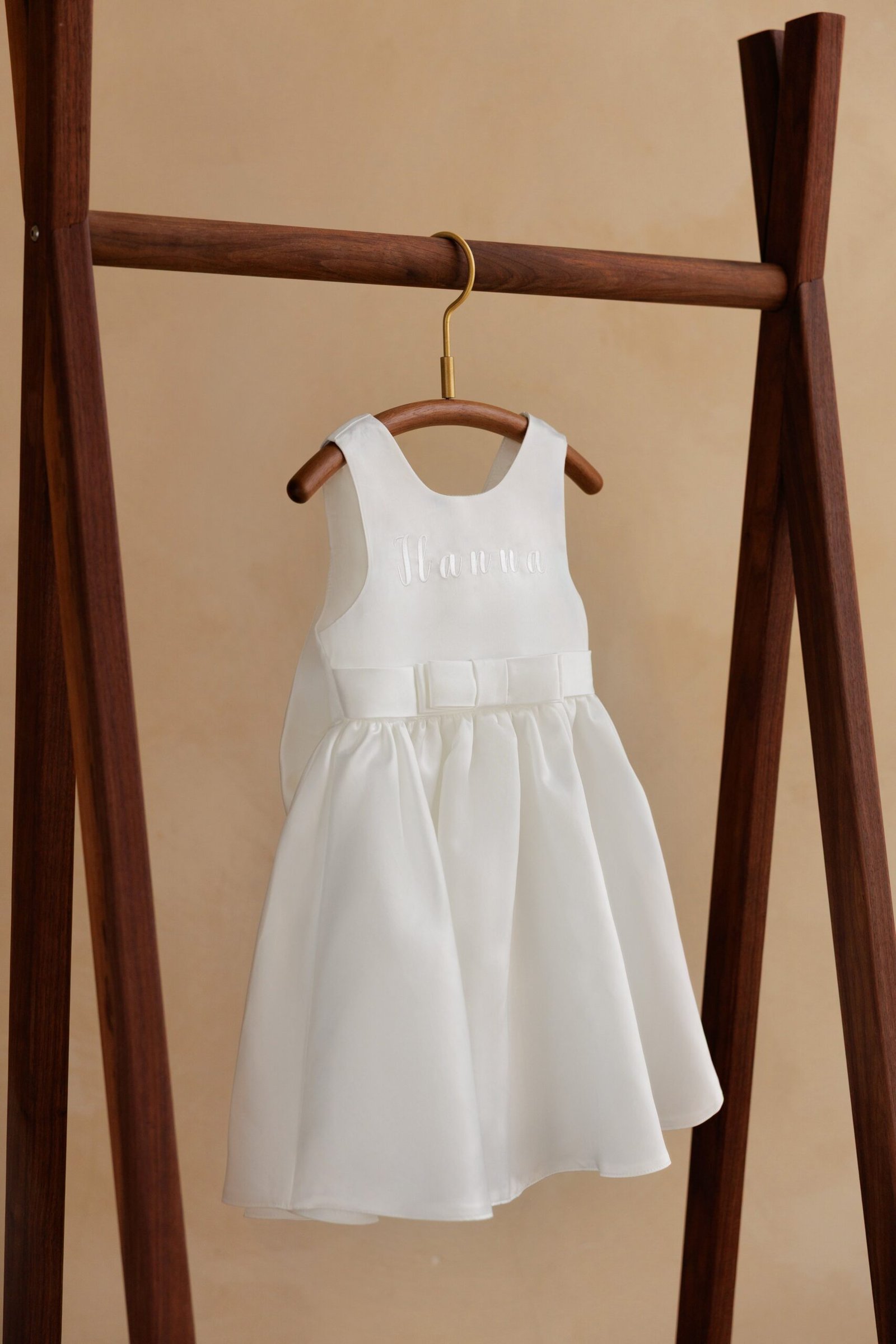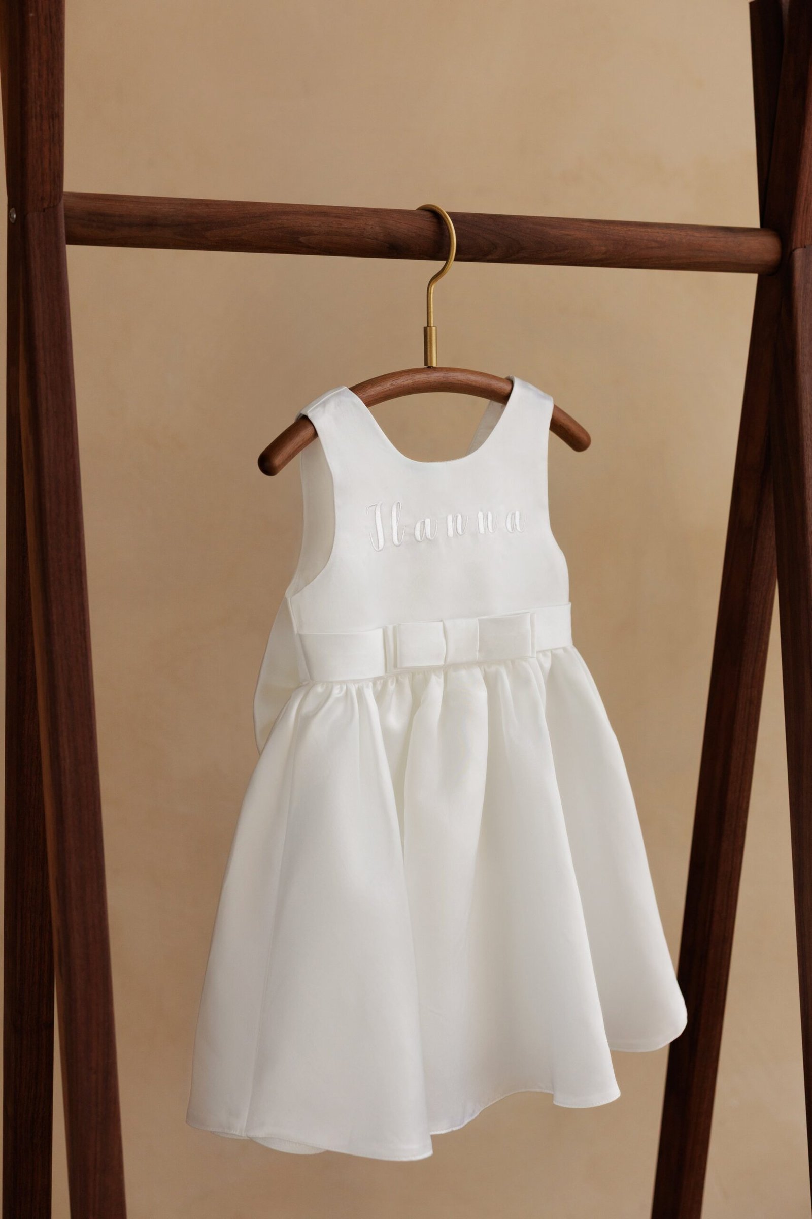 Dress with a round neckline and wide straps. Bow detail at the waist. Flared skirt. Personalized embroidery on the chest.