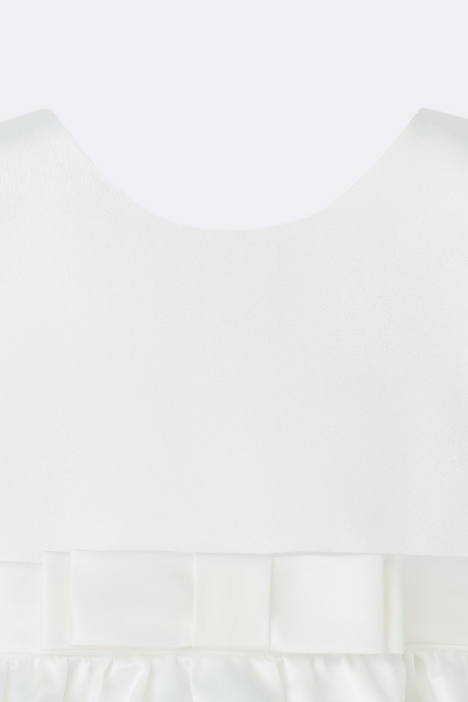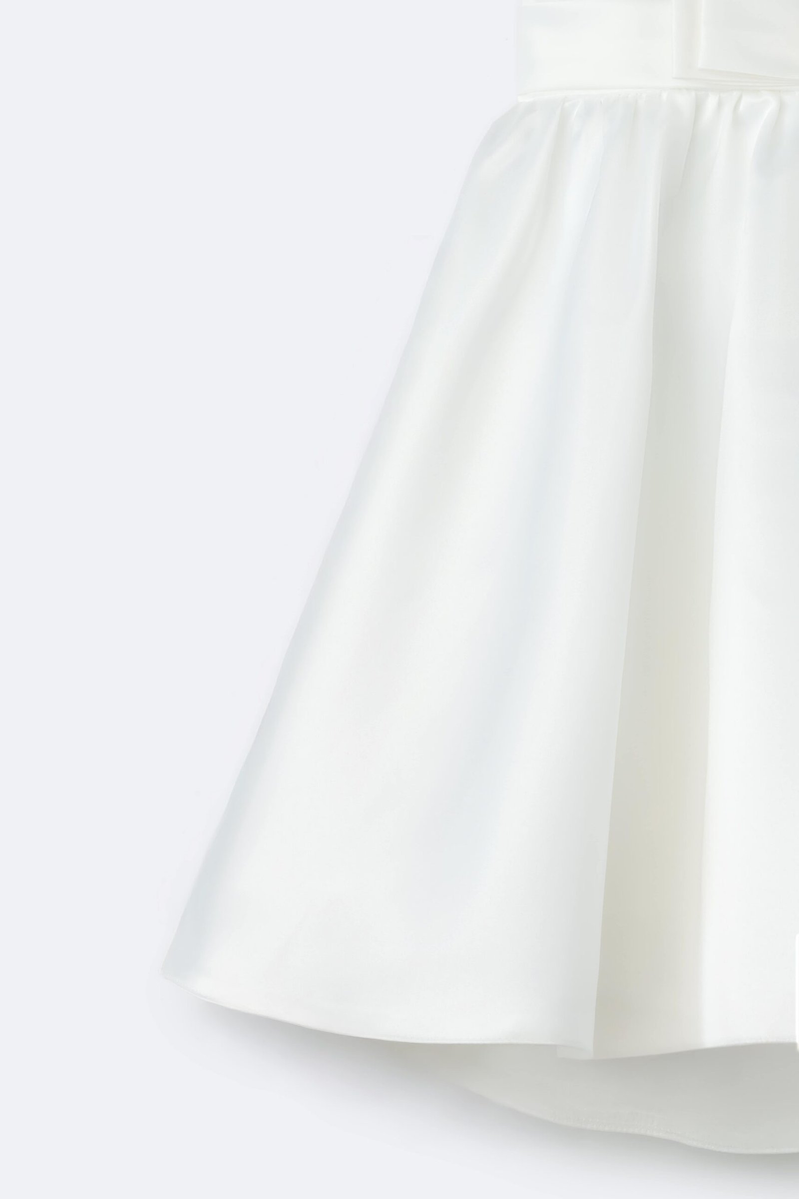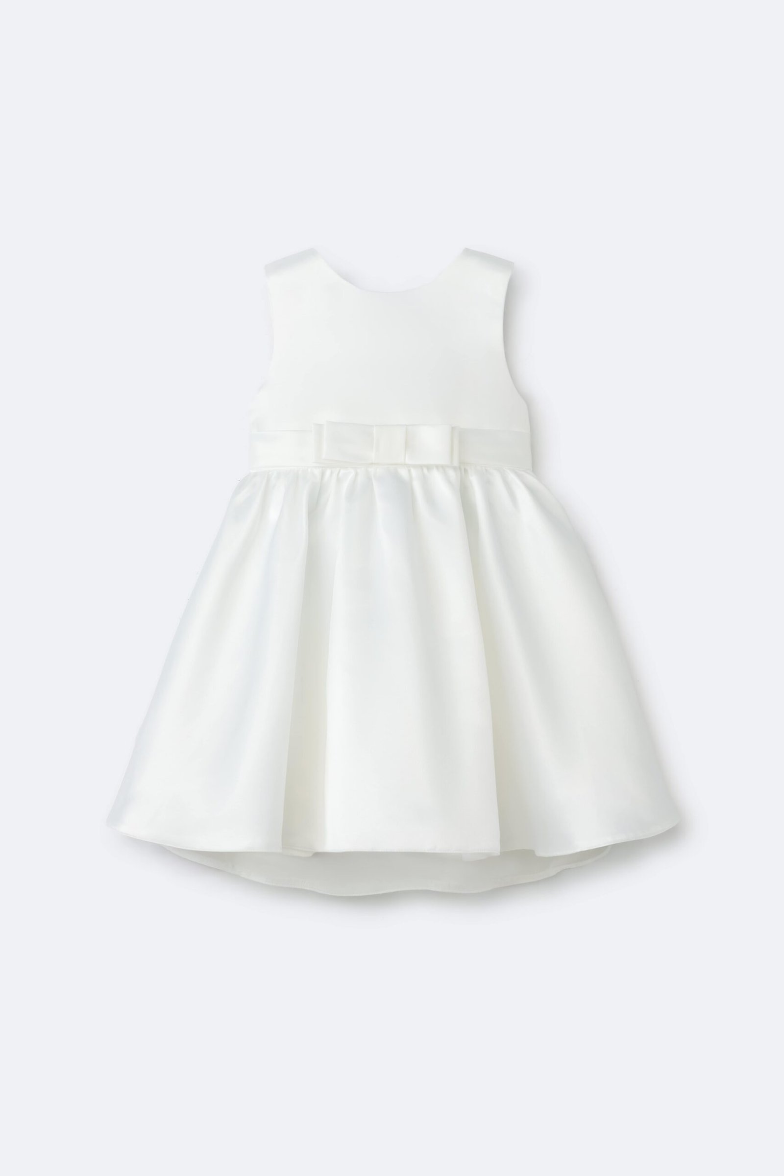 Dress with a round neckline and wide straps. Bow detail at the waist. Flared skirt. Personalized embroidery on the chest.