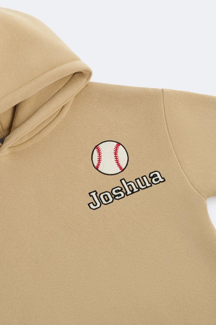 Two-piece fleece set with hoodie and jogger pants. Hoodie with baseball detail on the front. Elastic waist pants with ribbed hems.