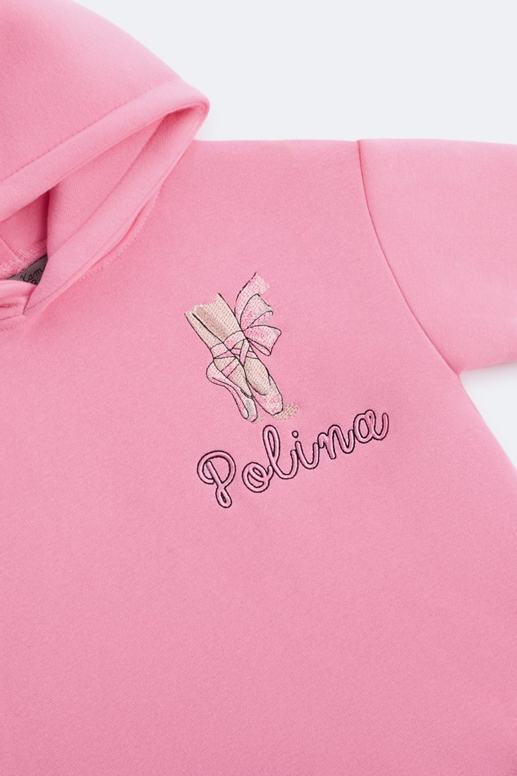 Two-piece fleece set with hoodie and jogger pants. Hoodie with ballet detail on the front. Elastic waist pants with ribbed hems.