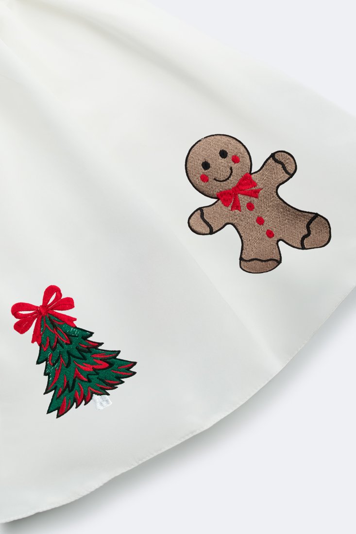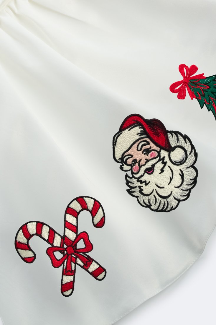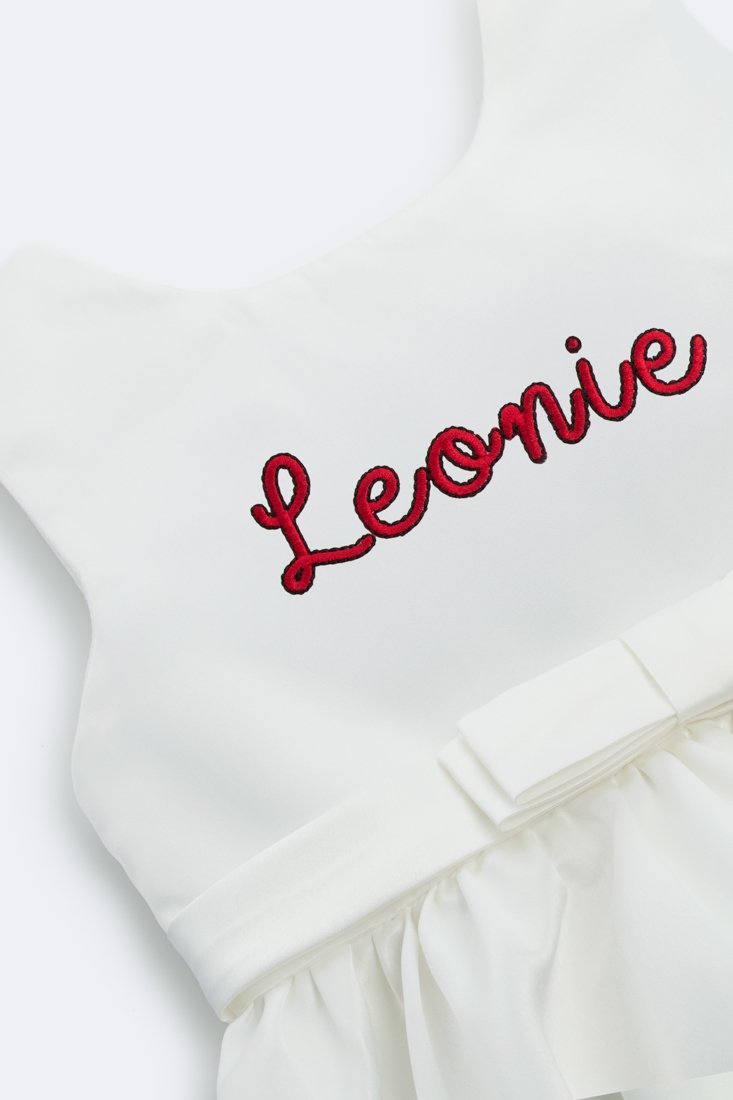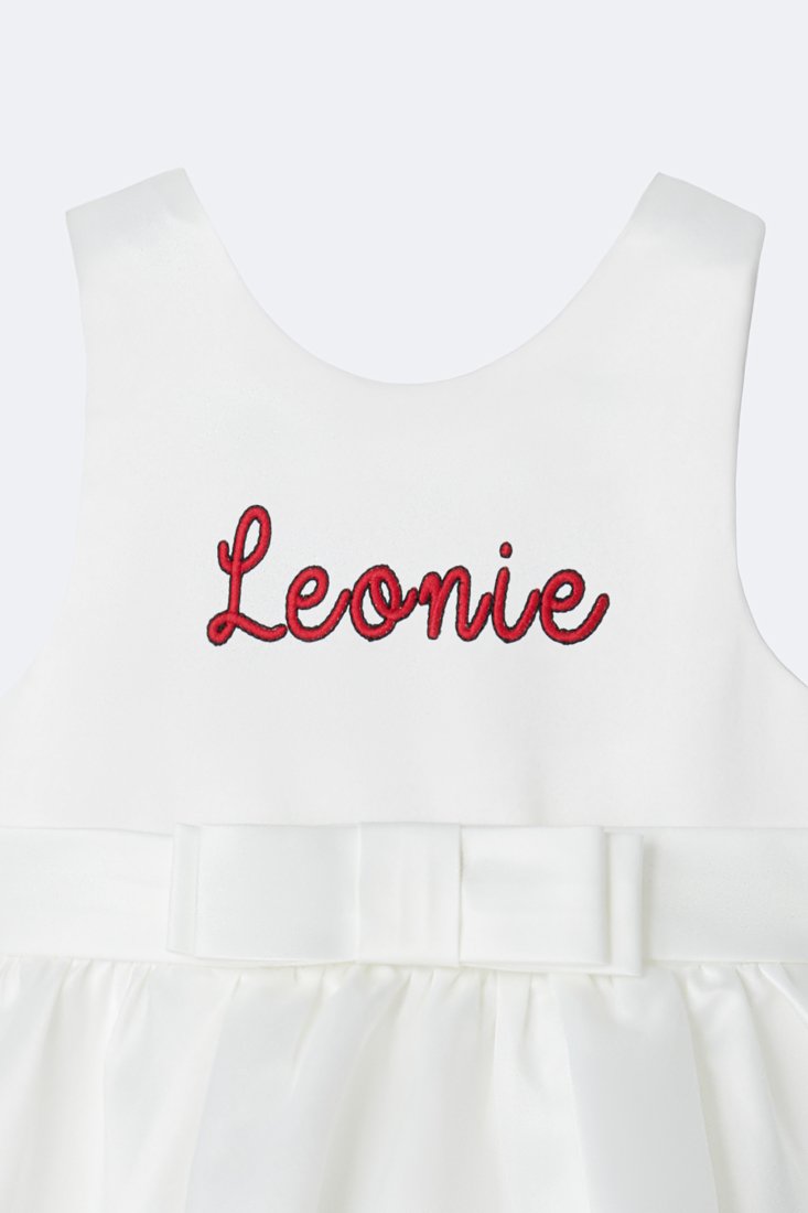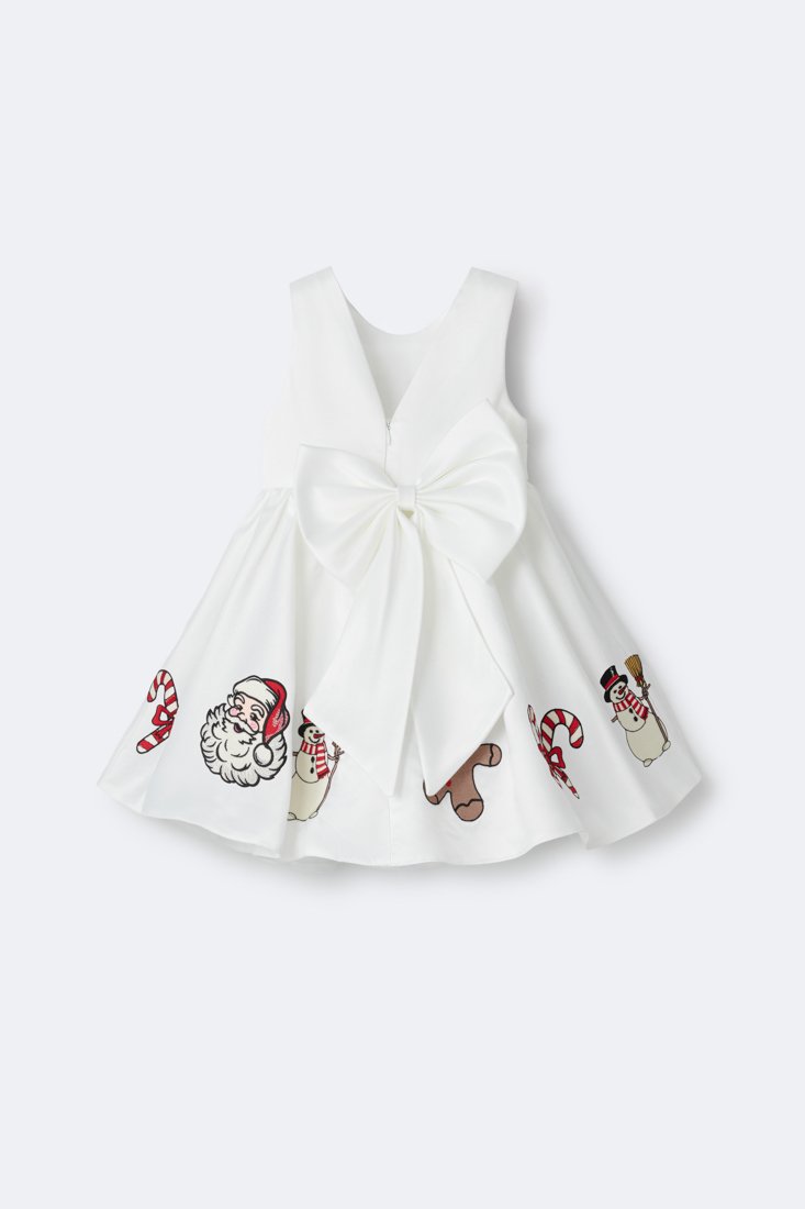 Sleeveless dress with a round neckline and full skirt. Name embroidery on the front. Holiday motif embroidered along the hem. Back closure with zipper and oversized bow detail.