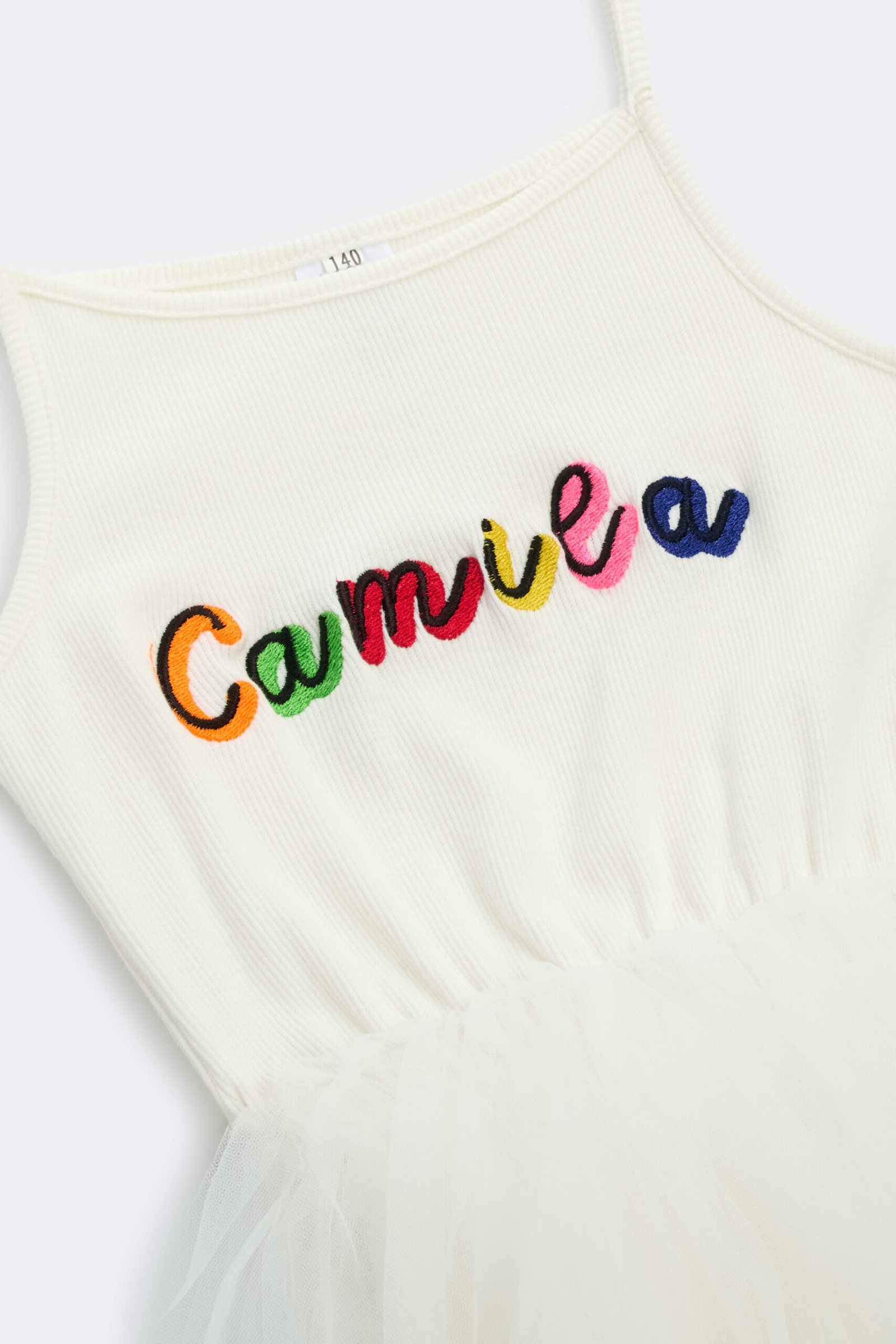 Sleeveless dress with thin straps, embroidered front and long tulle skirt.