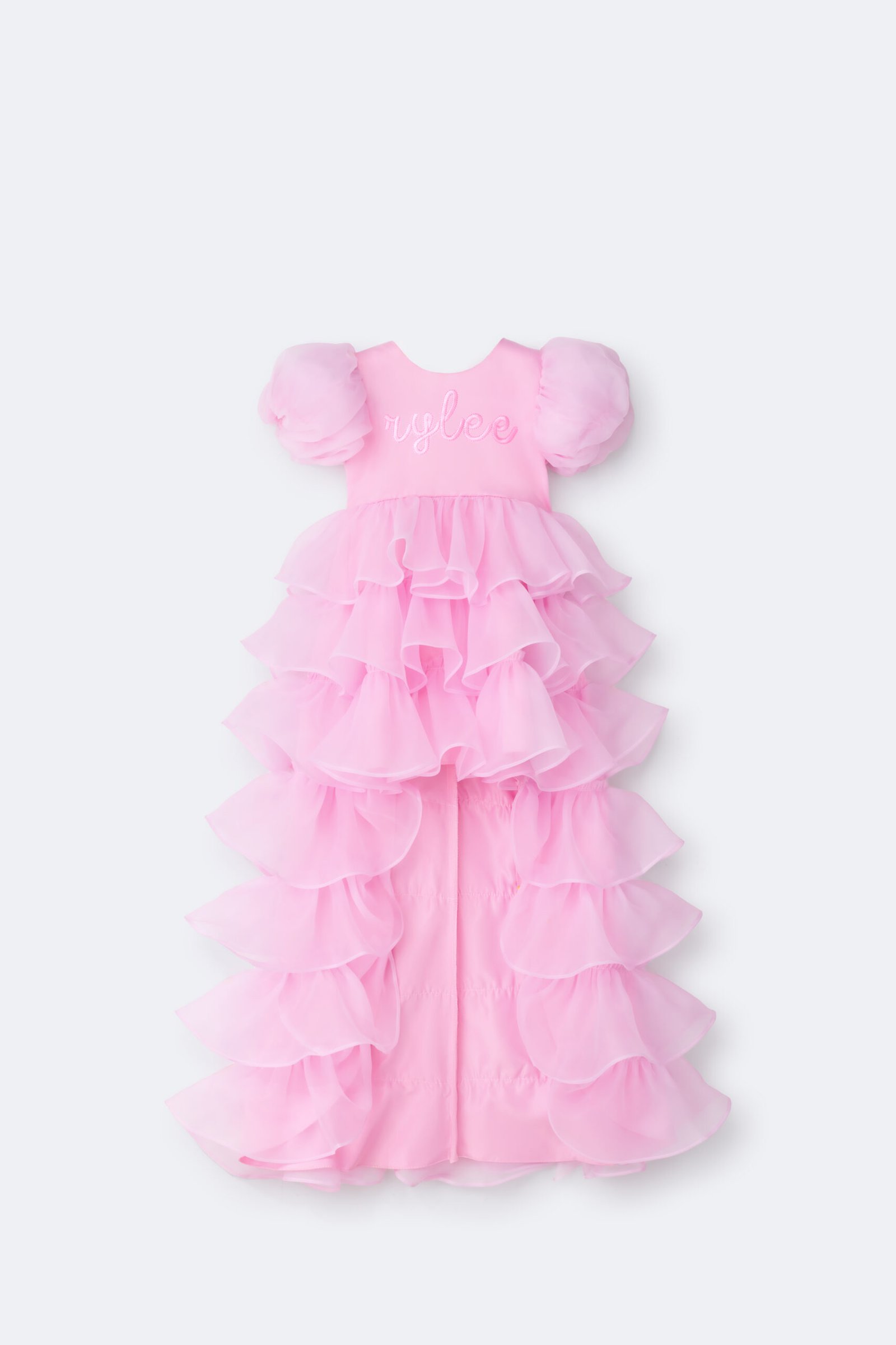 Lightweight organza dress with layered ruffles and extended back hem. Puff sleeves. Back bow detail. Full skirt.