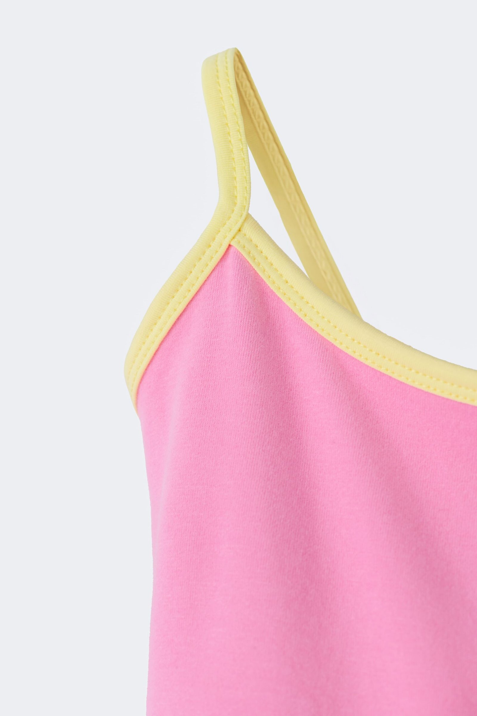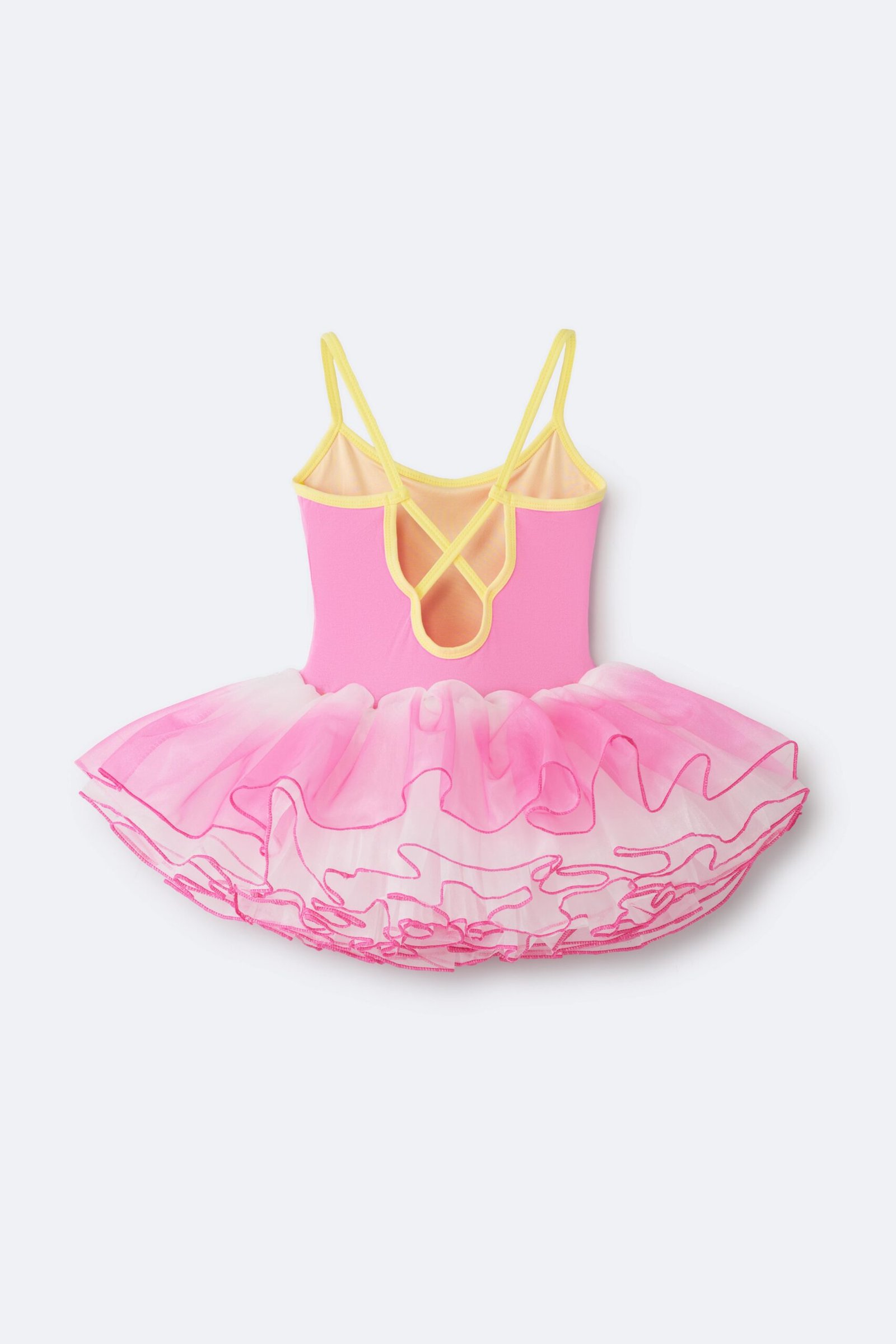 Sleeveless ballet-style dress with contrast yellow straps and a soft gradient tulle skirt.