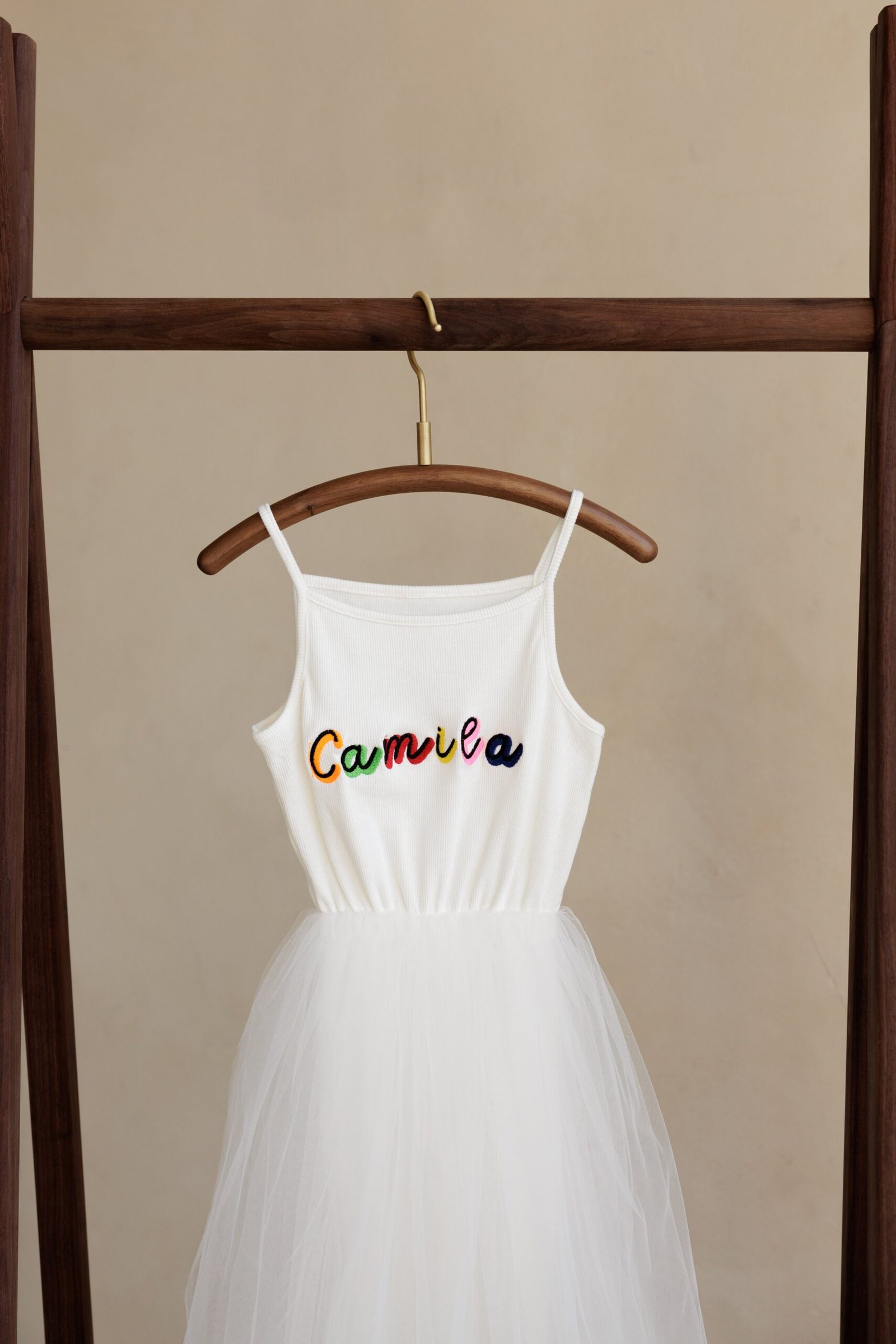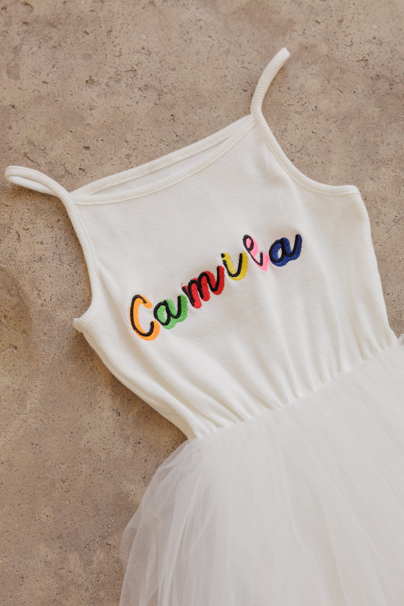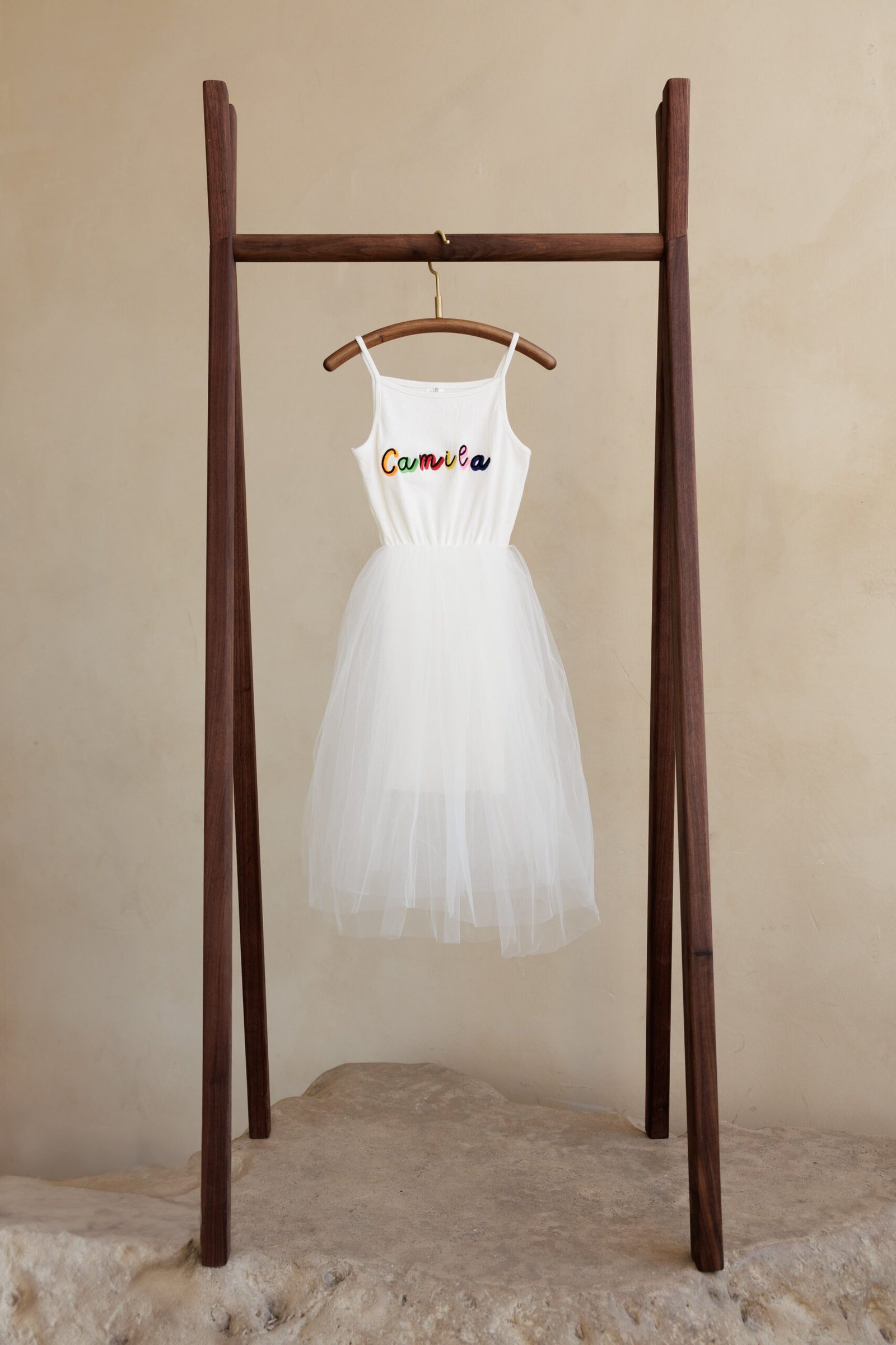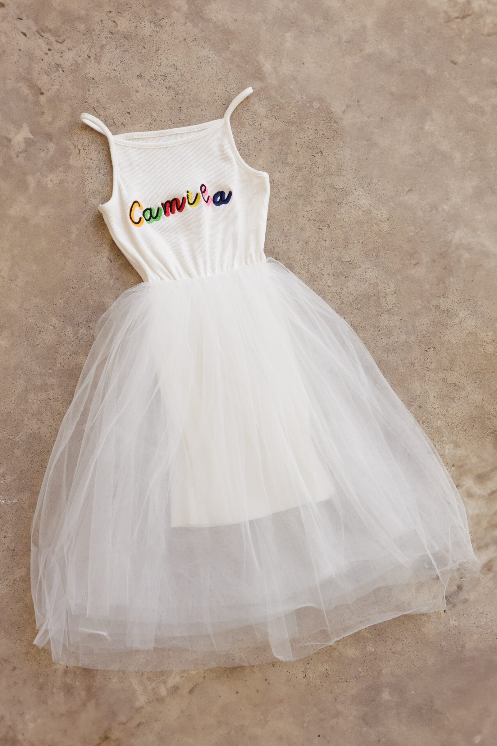 Sleeveless dress with thin straps, embroidered front and long tulle skirt.