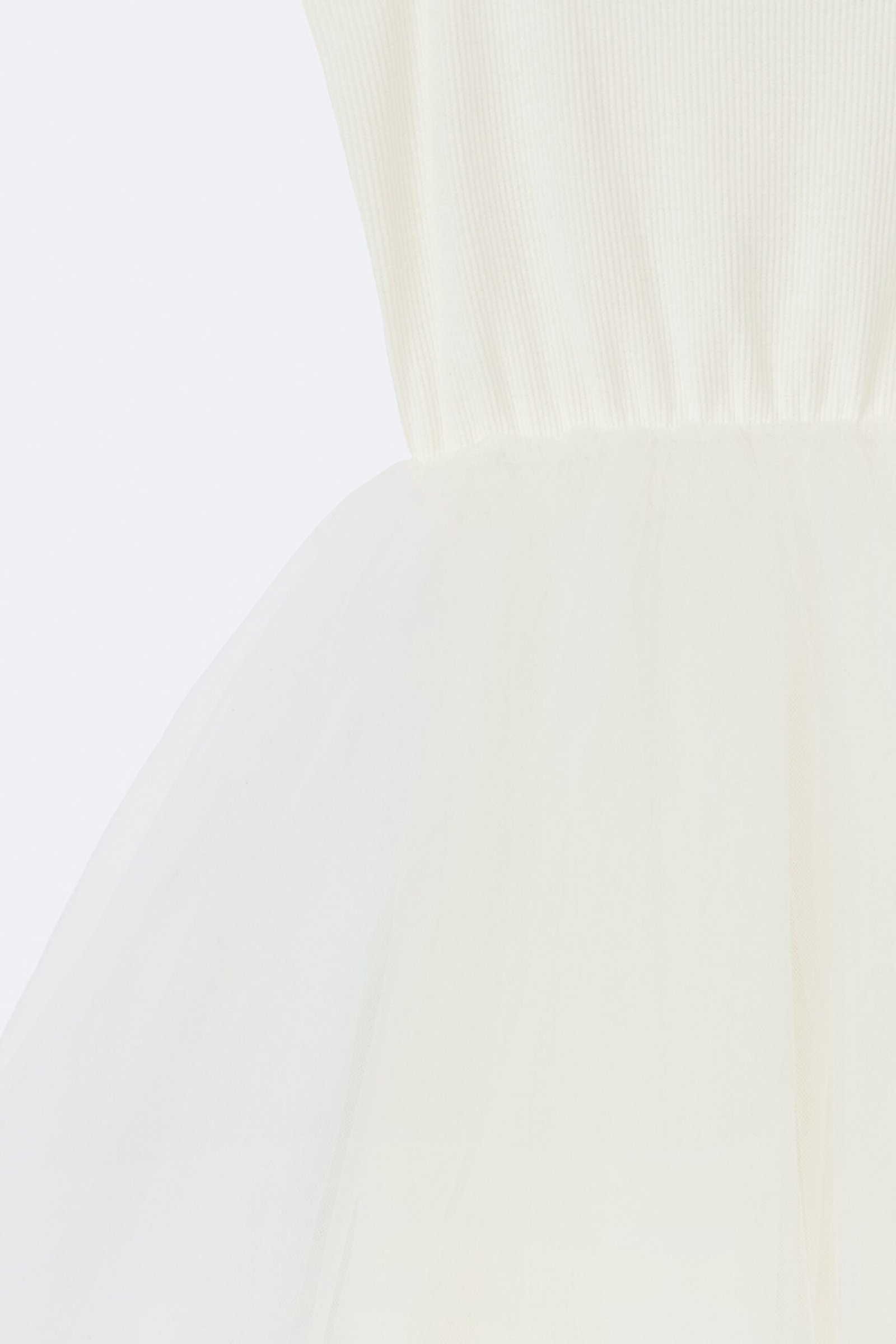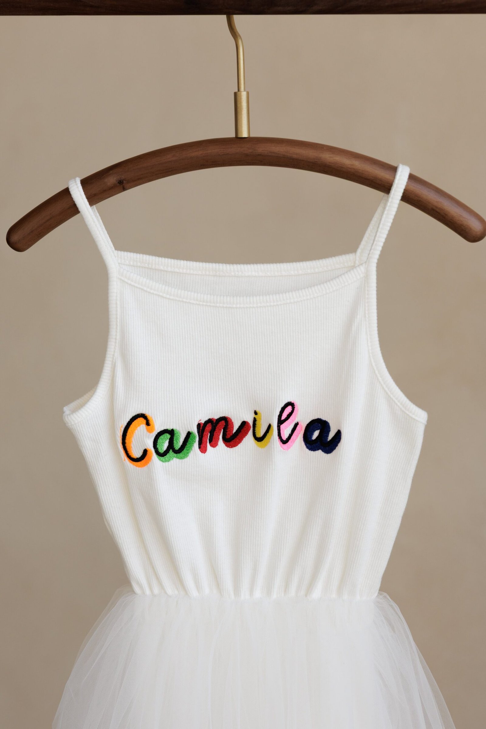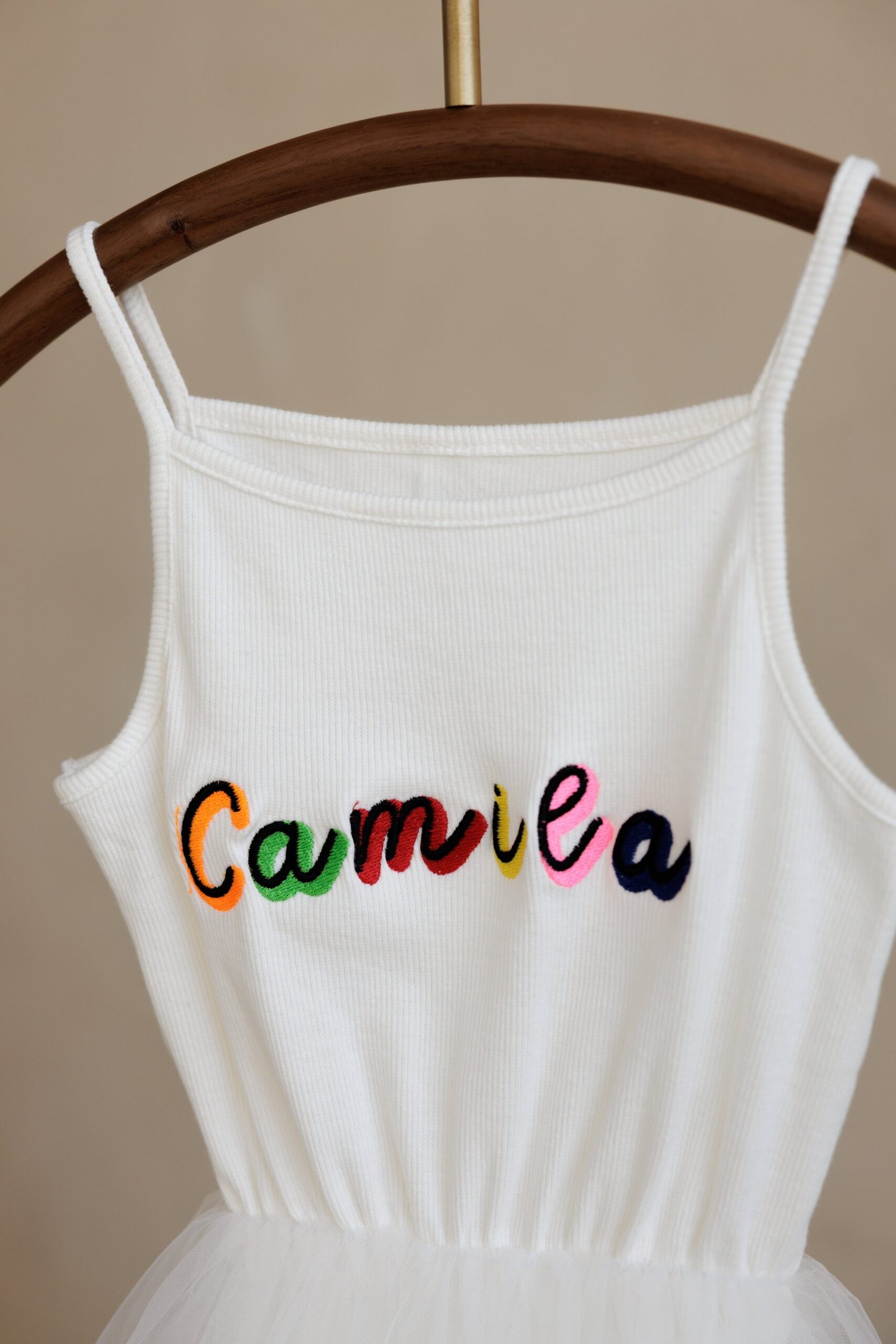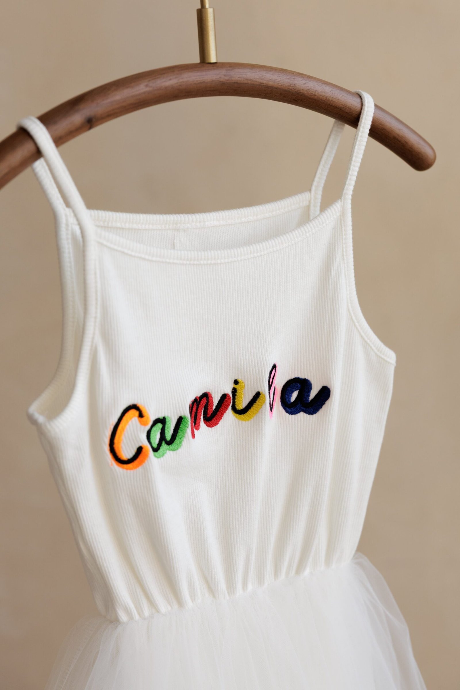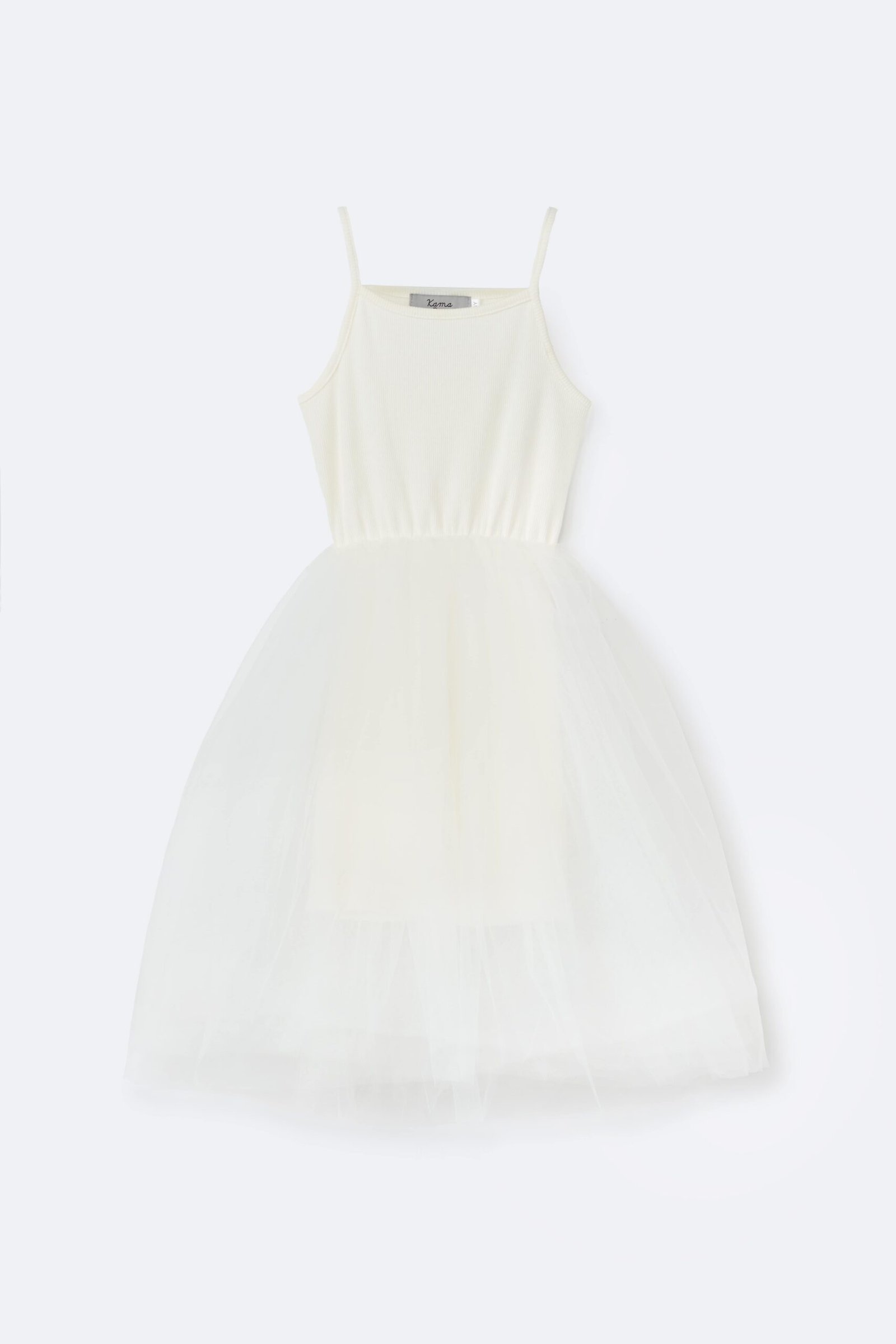 Sleeveless dress with thin straps, embroidered front and long tulle skirt.