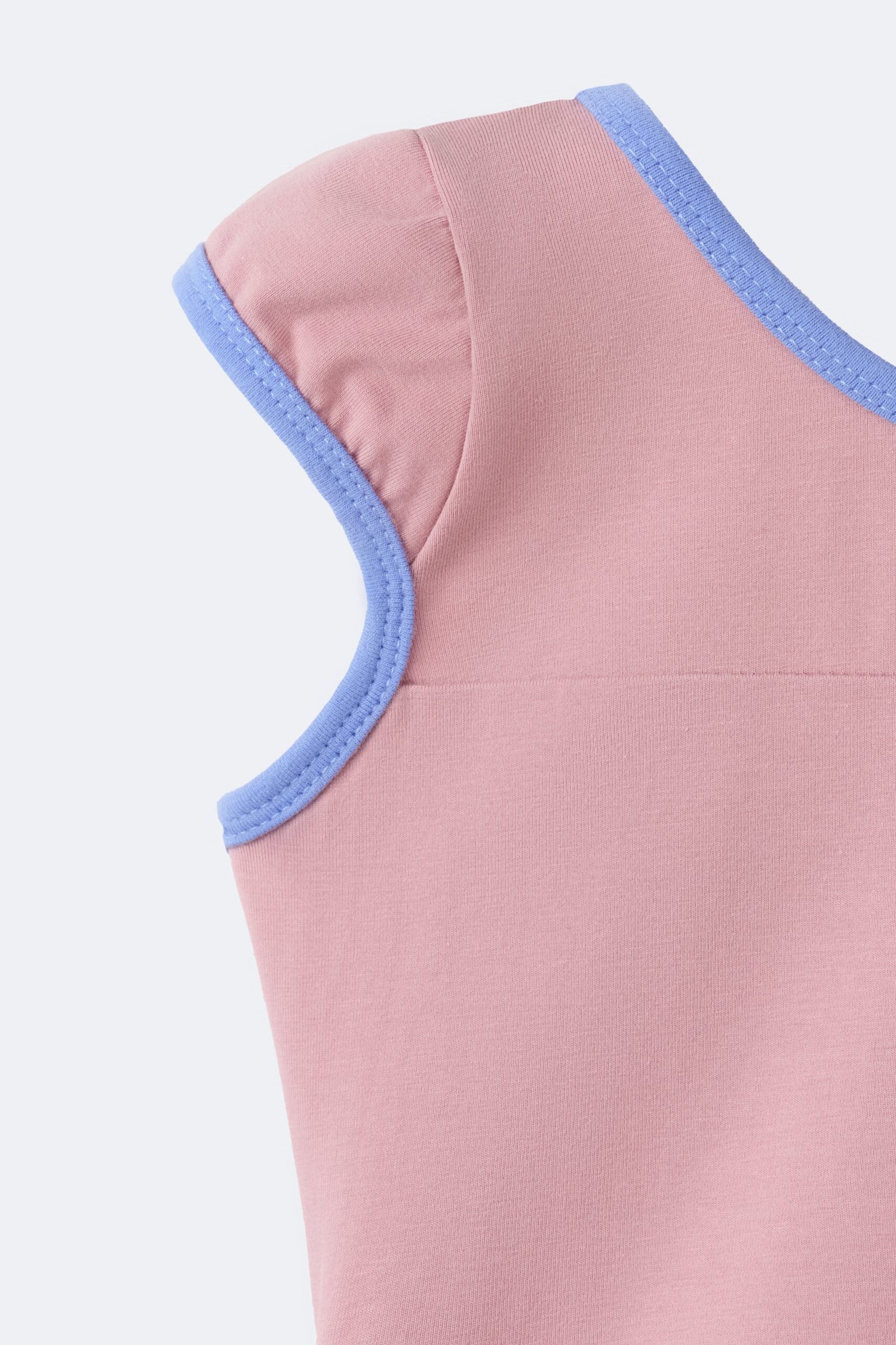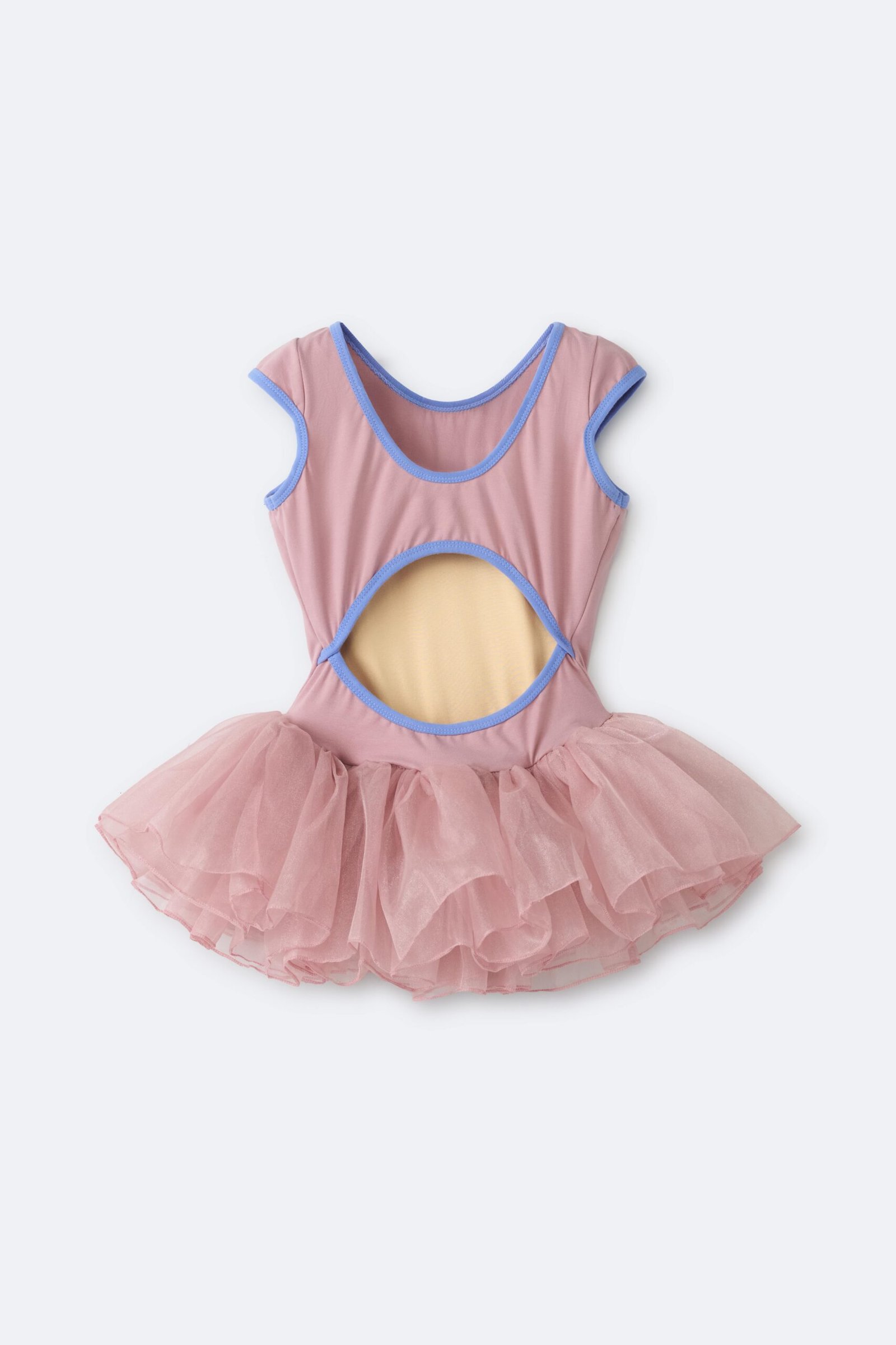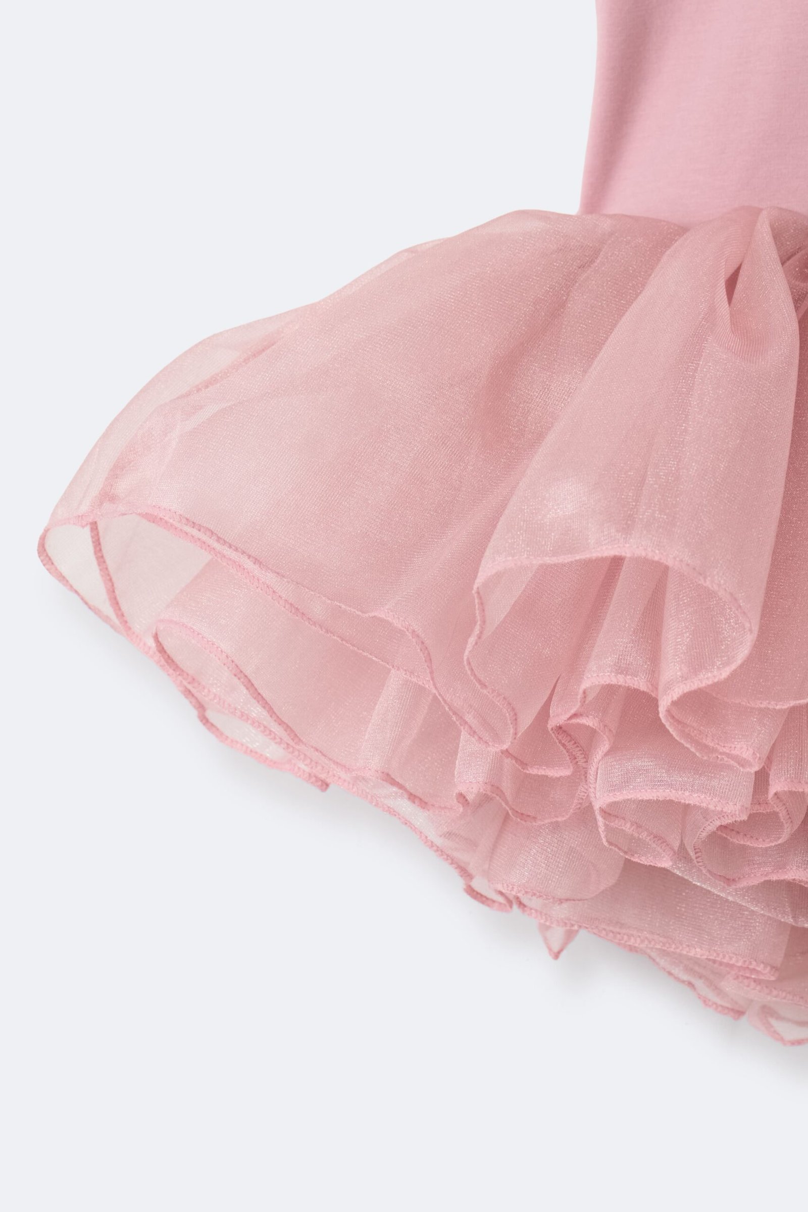 Sleeveless dress with contrast trim, ruffle sleeves and layered tulle skirt.