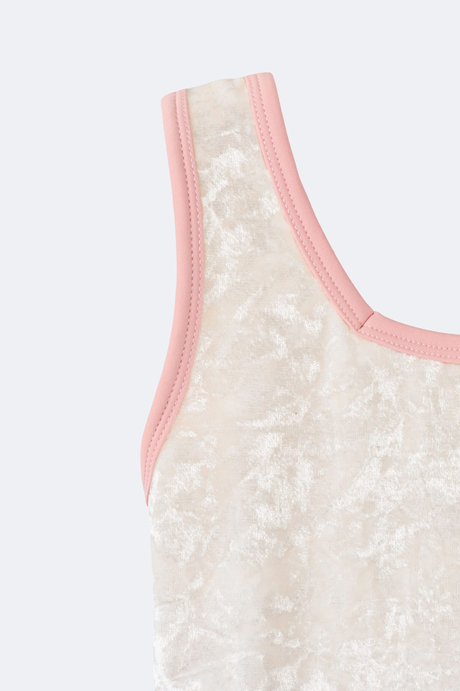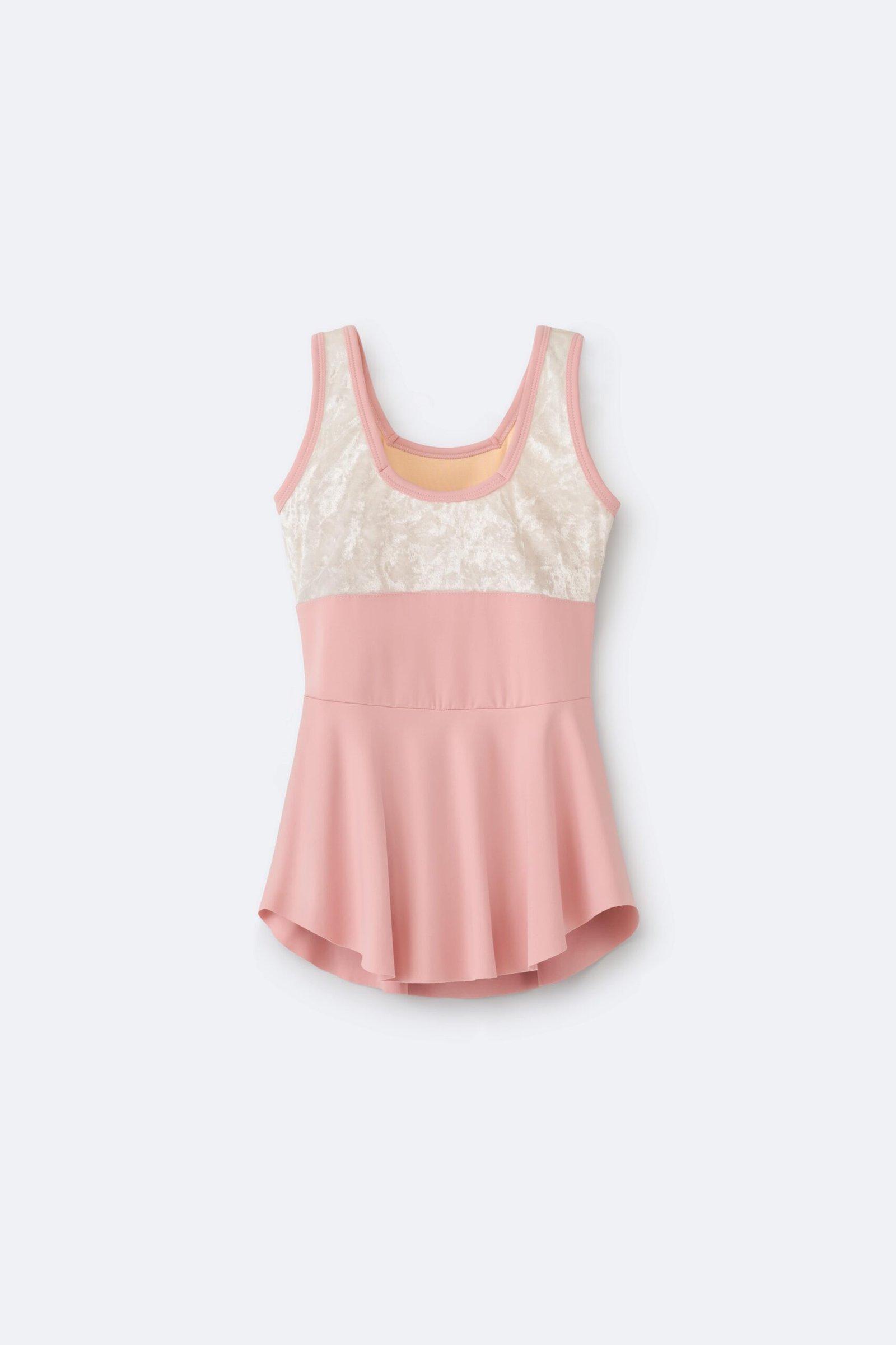 Sleeveless dress with contrast velvet-style upper panel and flared hem.