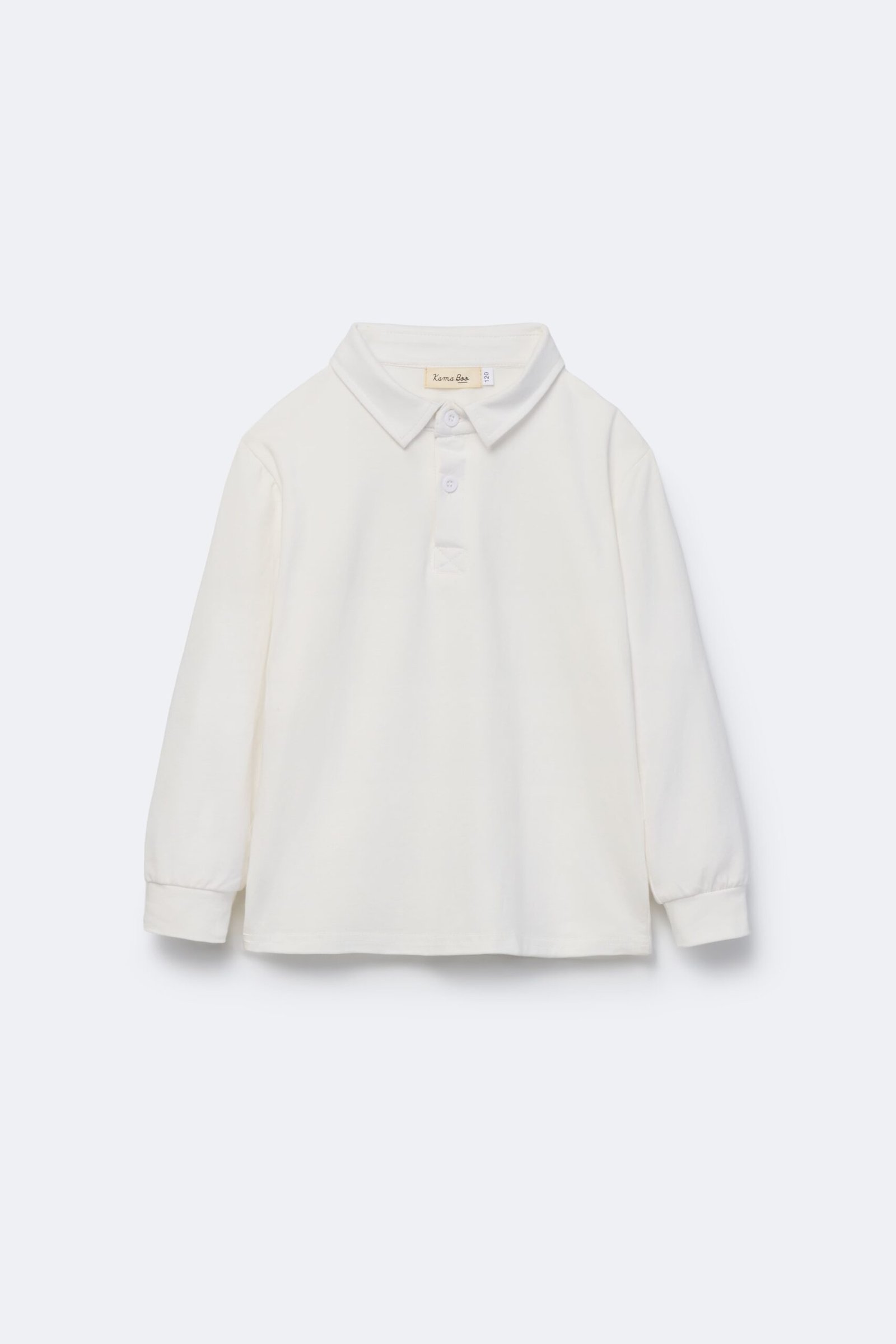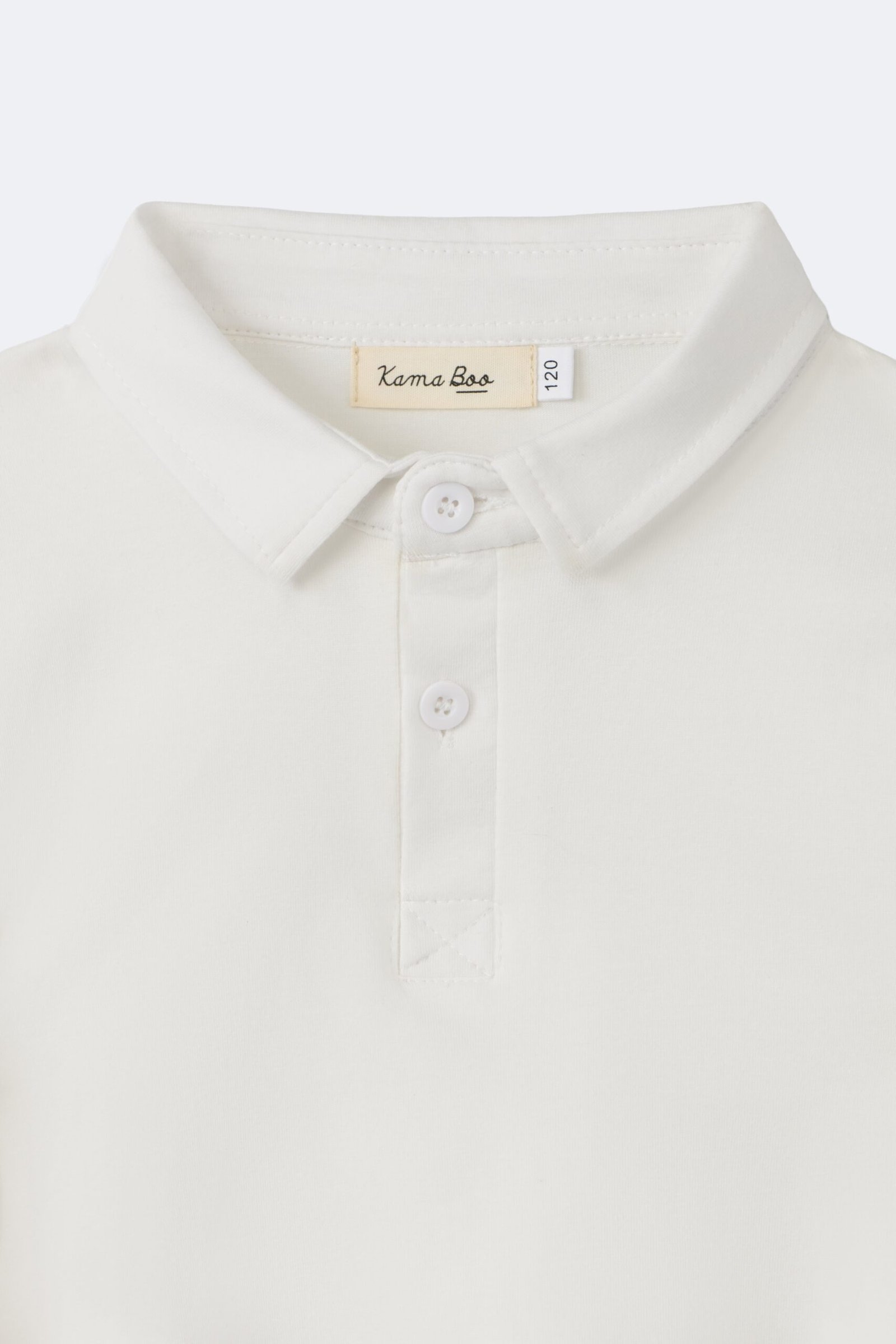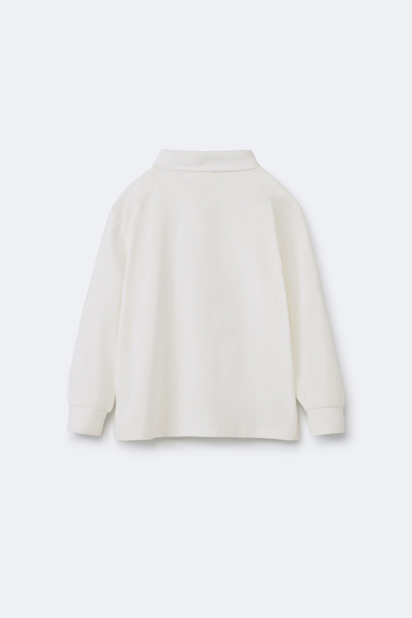 Classic long sleeve polo shirt made from soft cotton fabric. Featuring a pointed collar, front button placket, and straight hem. Back detail with embroidered lettering adds a personalized touch.