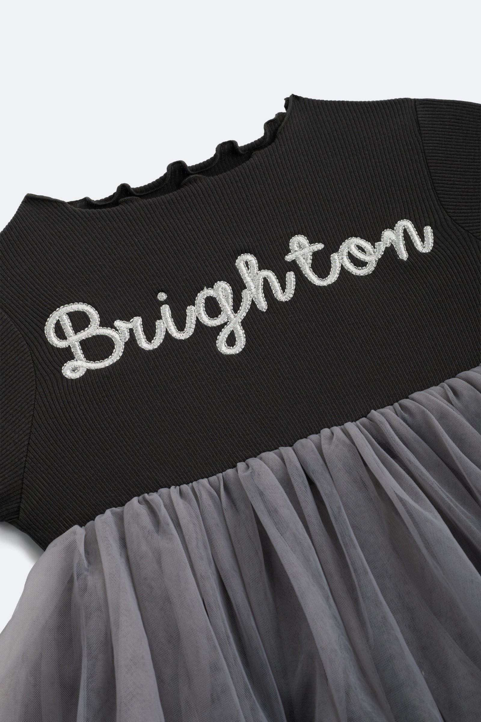 Long-sleeve dress with a gathered waist and a layered tulle skirt.