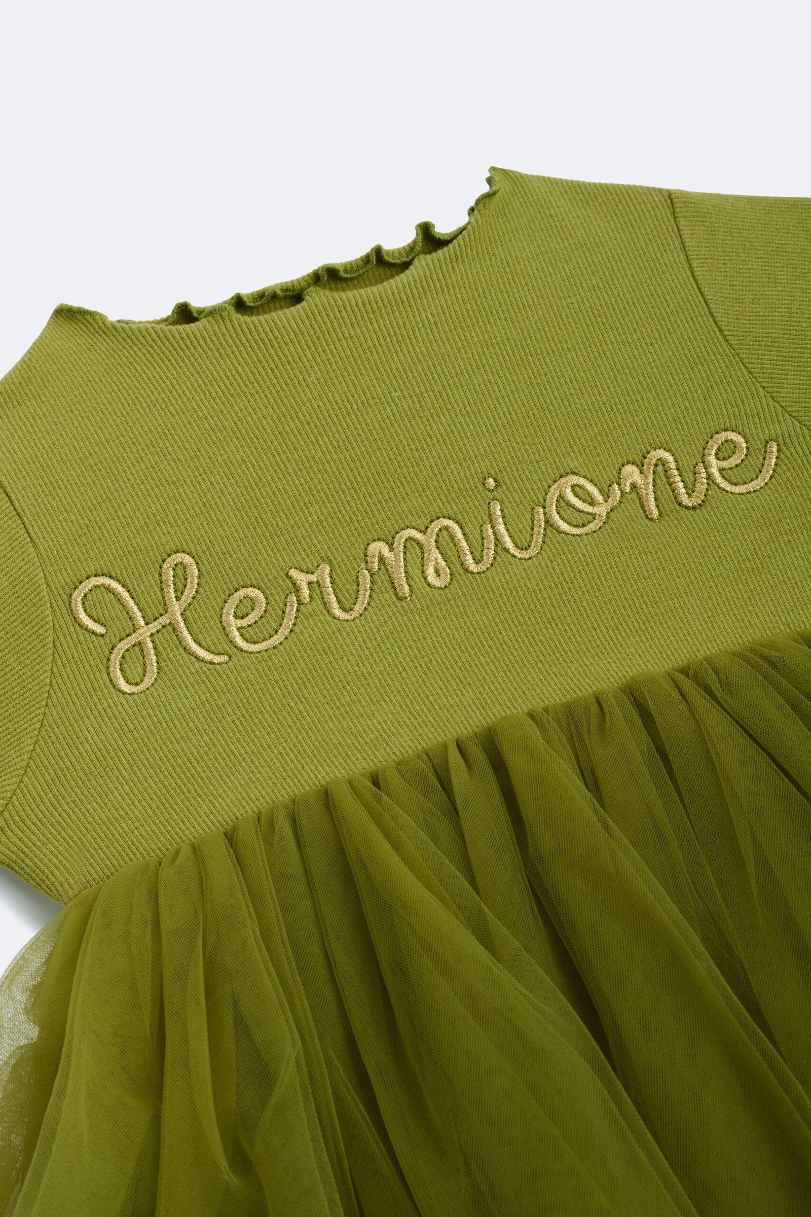 Long-sleeve dress with a gathered waist and a layered tulle skirt.