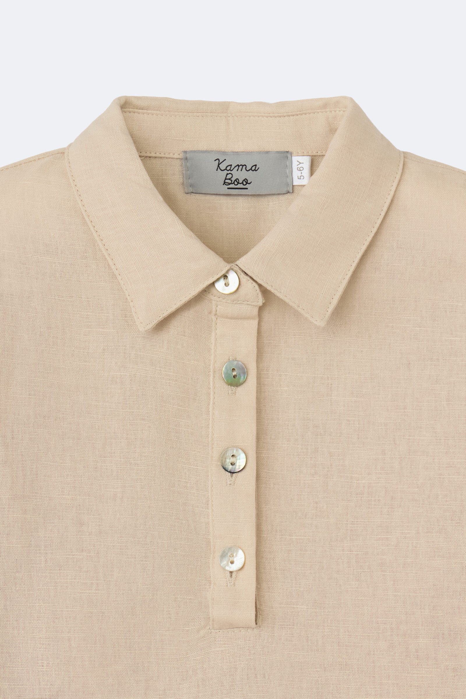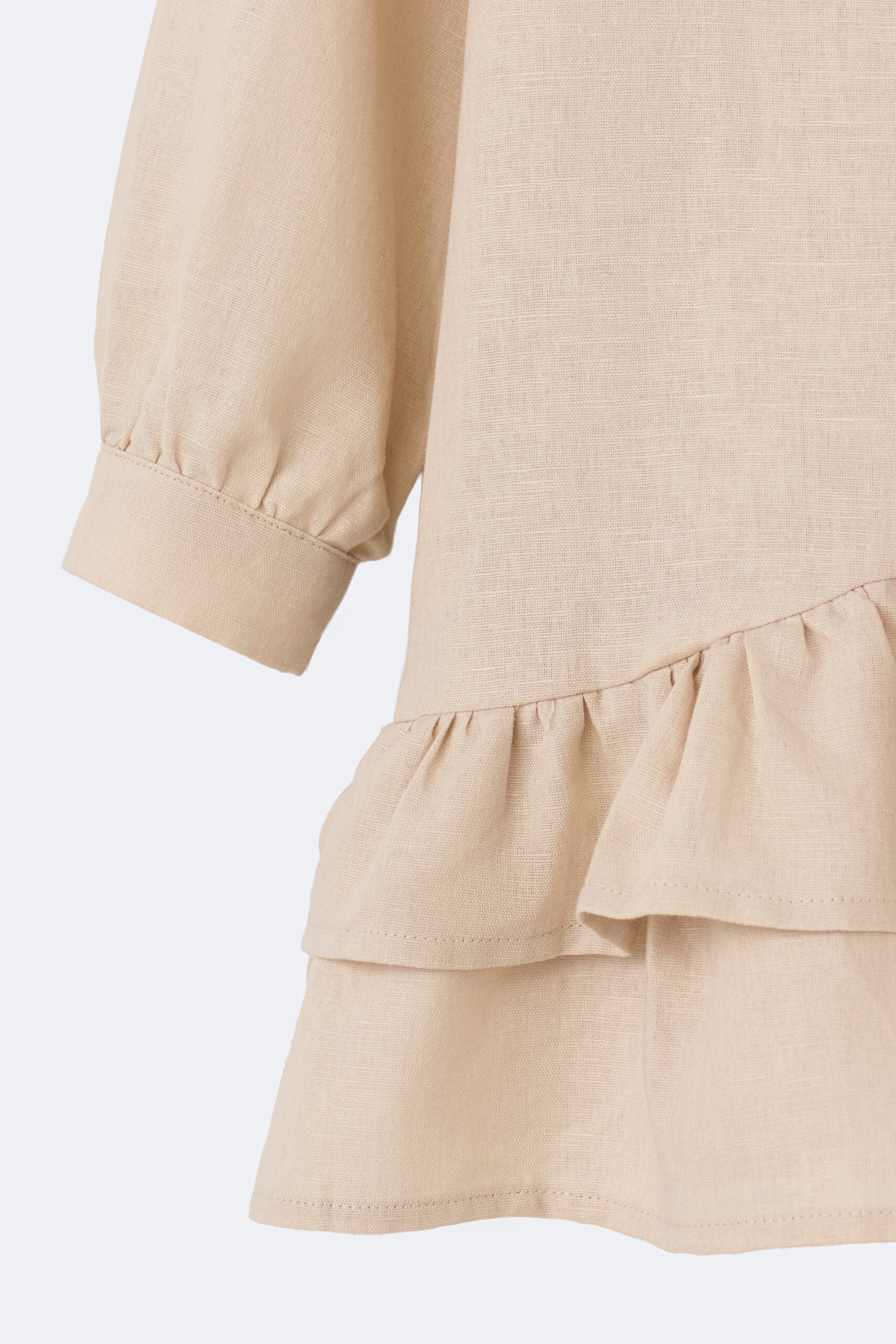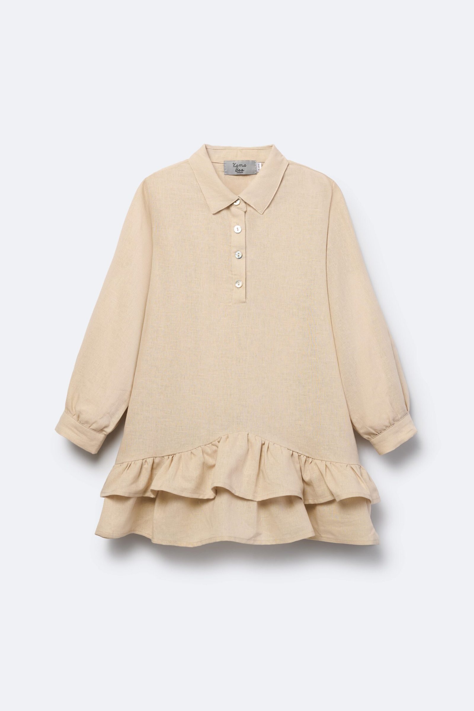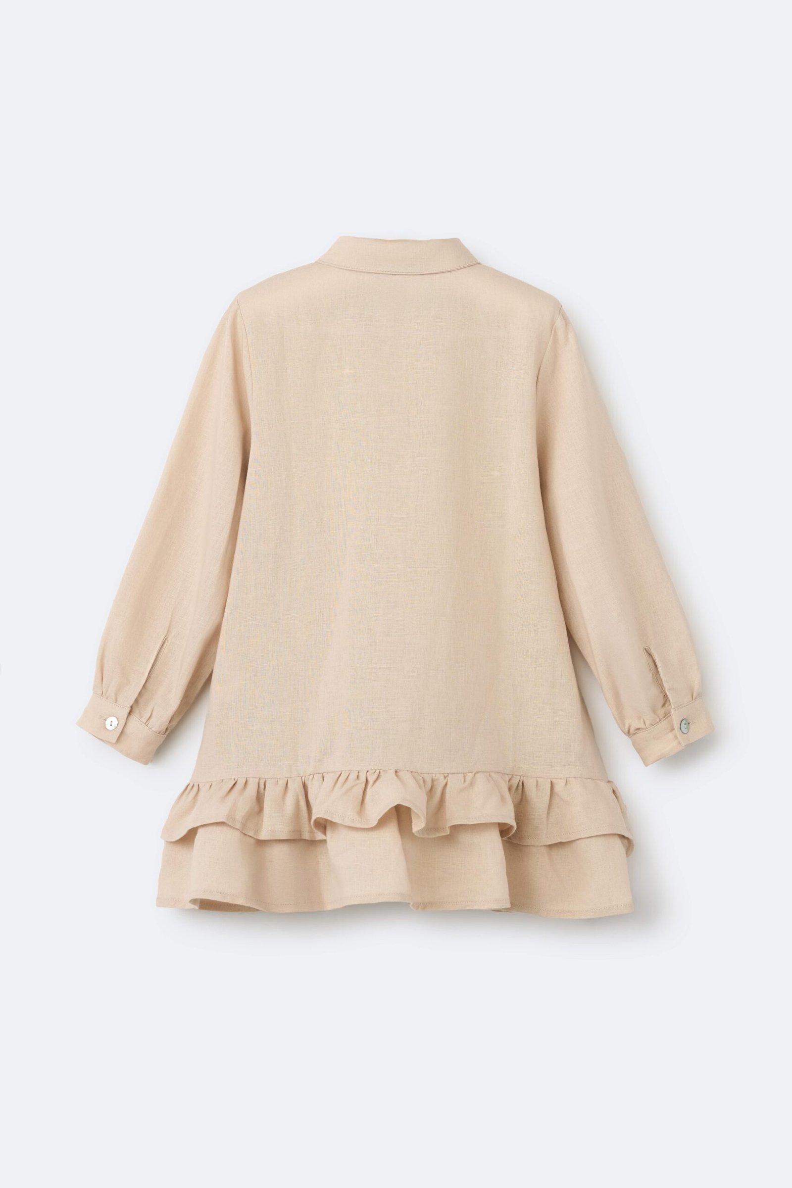 Collared shirt dress with long sleeves and buttoned cuffs. Front button fastening with a ruffled hem detail. Personalized embroidery at the back.
