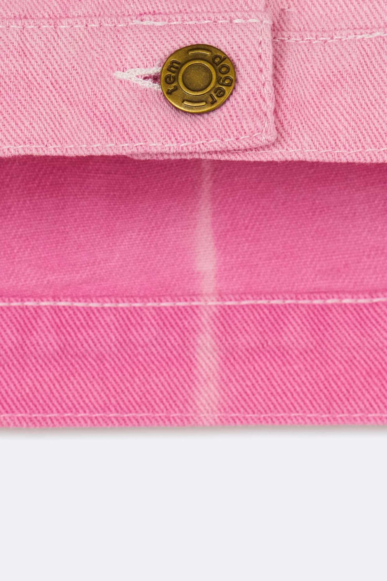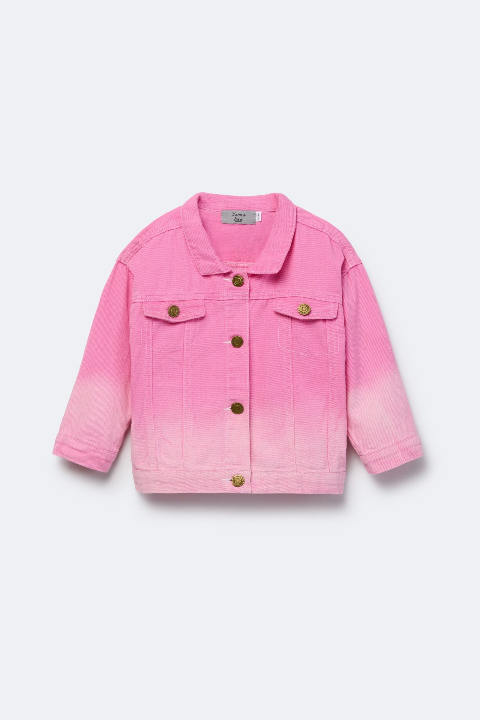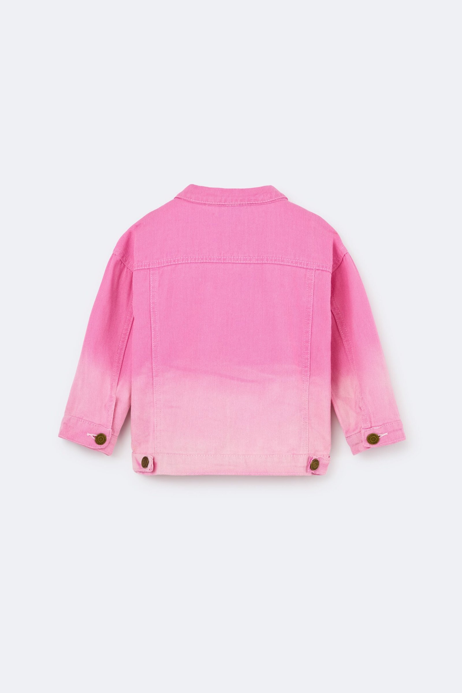 Denim jacket with a classic collar and long sleeves with buttoned cuffs. Button-up front and front flap pockets. Personalized embroidery on the back.
