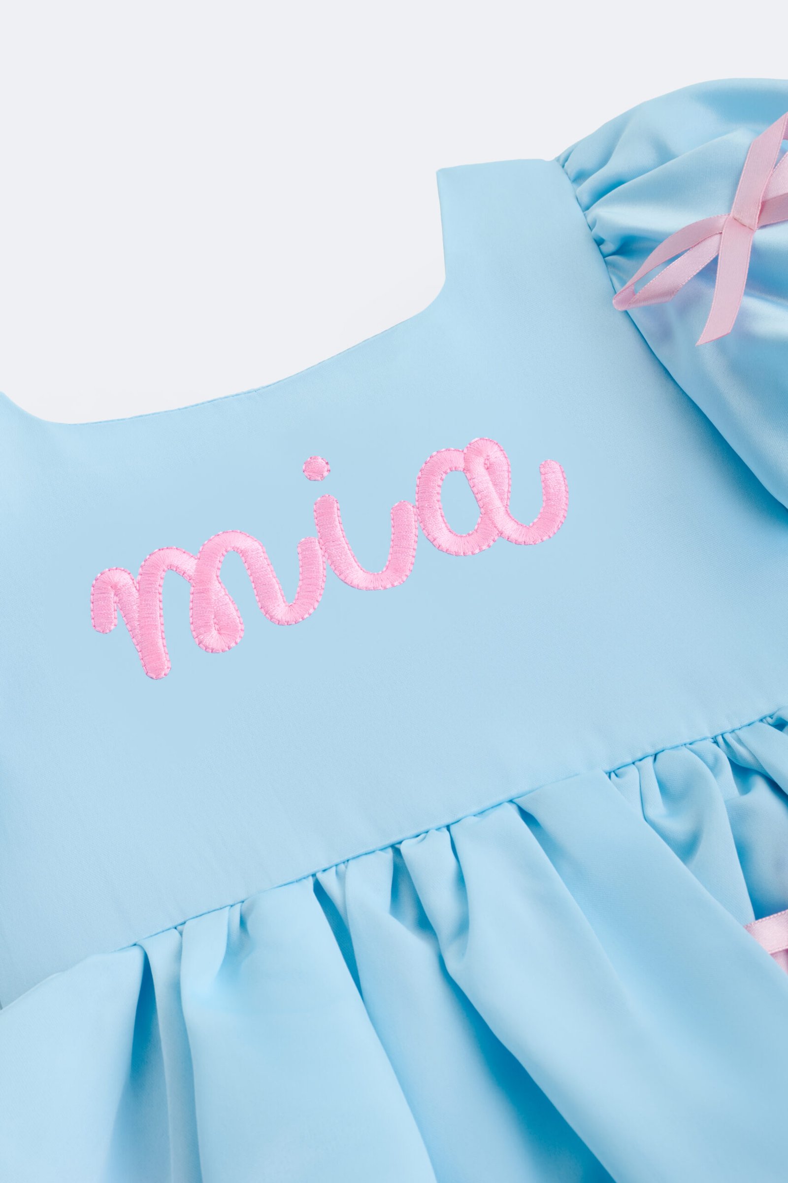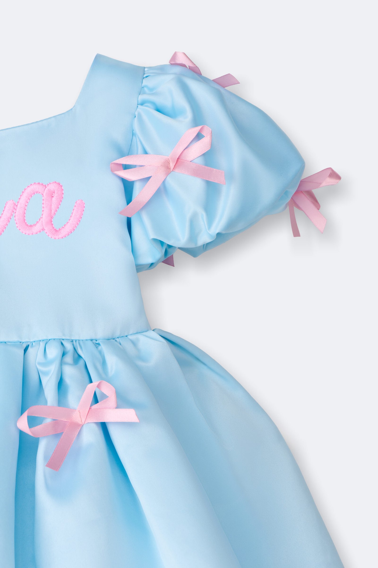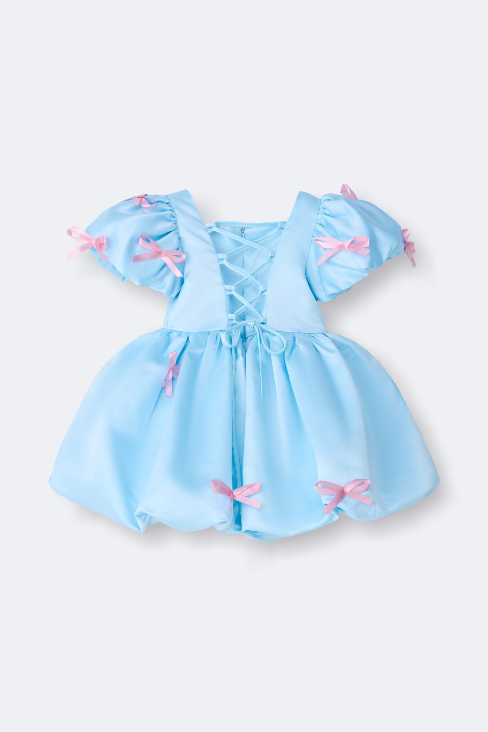 Satin dress with a structured bodice and voluminous skirt. Designed with puff sleeves and multiple ribbon accents throughout. Features a lace-up back for an adjustable fit.