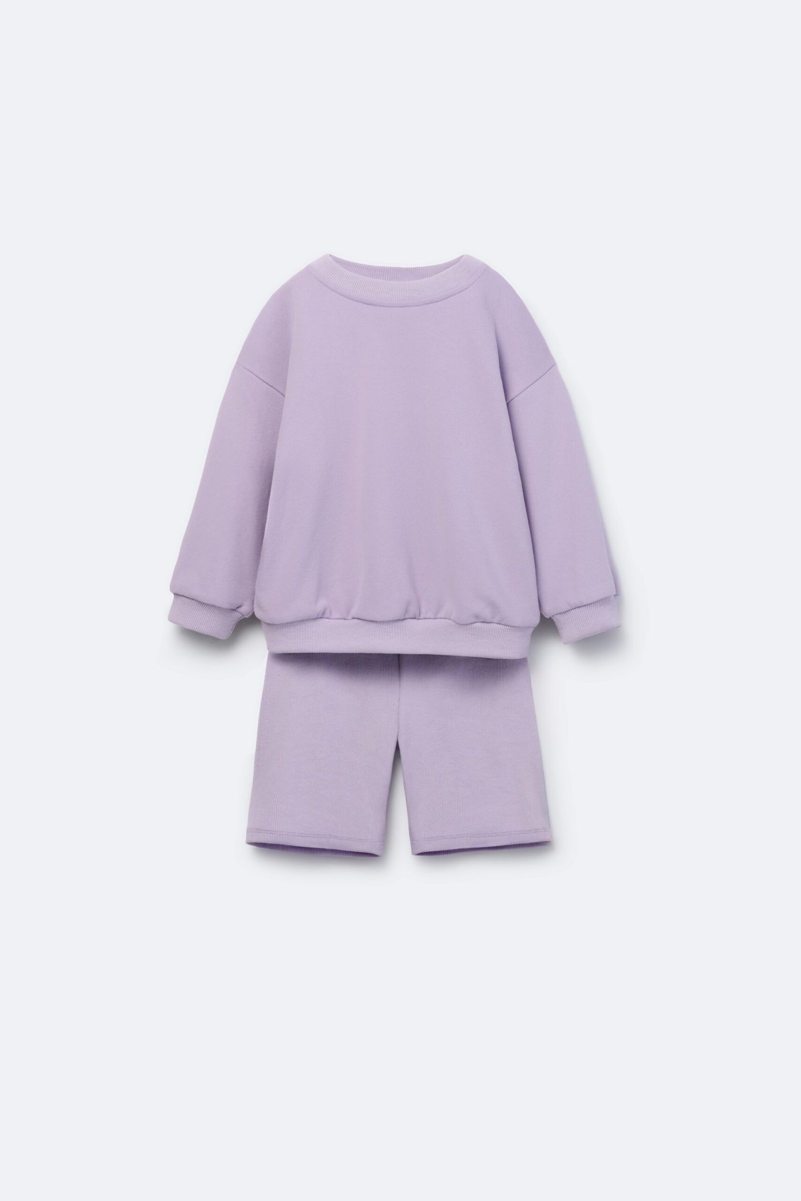 Set featuring a round-neck sweatshirt with long sleeves and ribbed trims. Personalized embroidery detail on the chest. Matching leggings with an elastic waistband. Neutral modern color, perfect for boys or girls.
